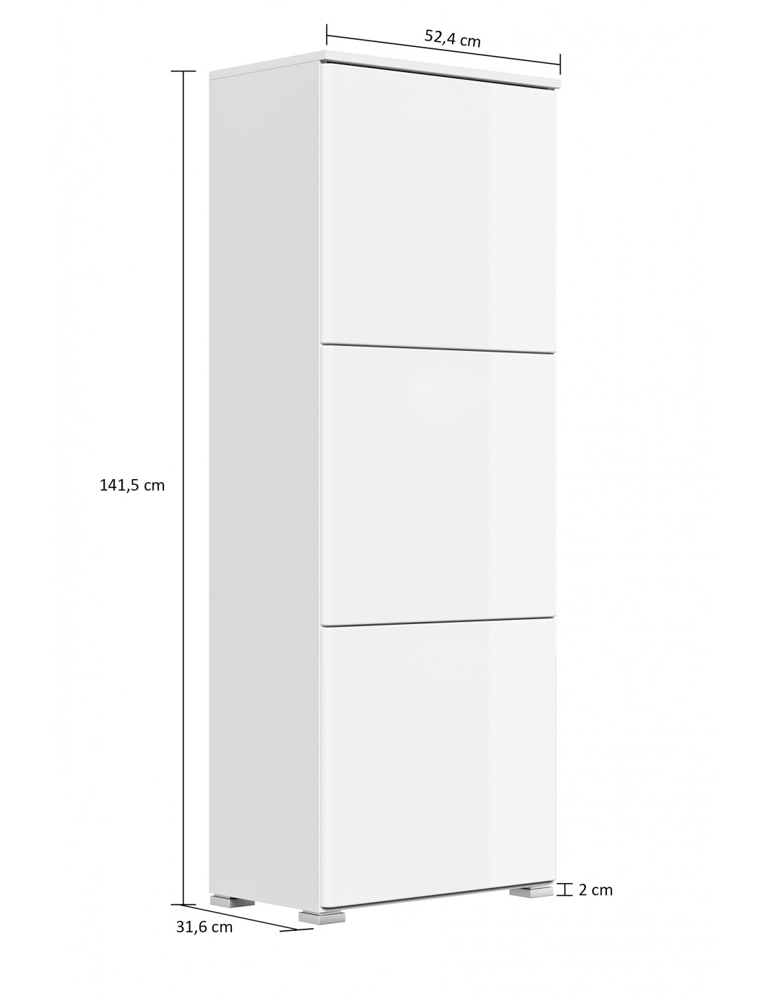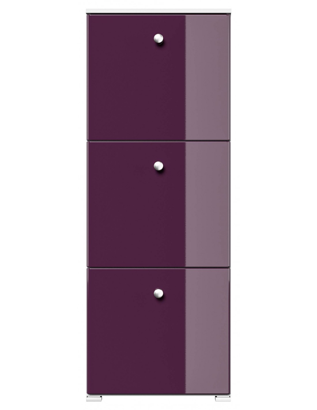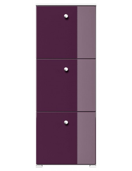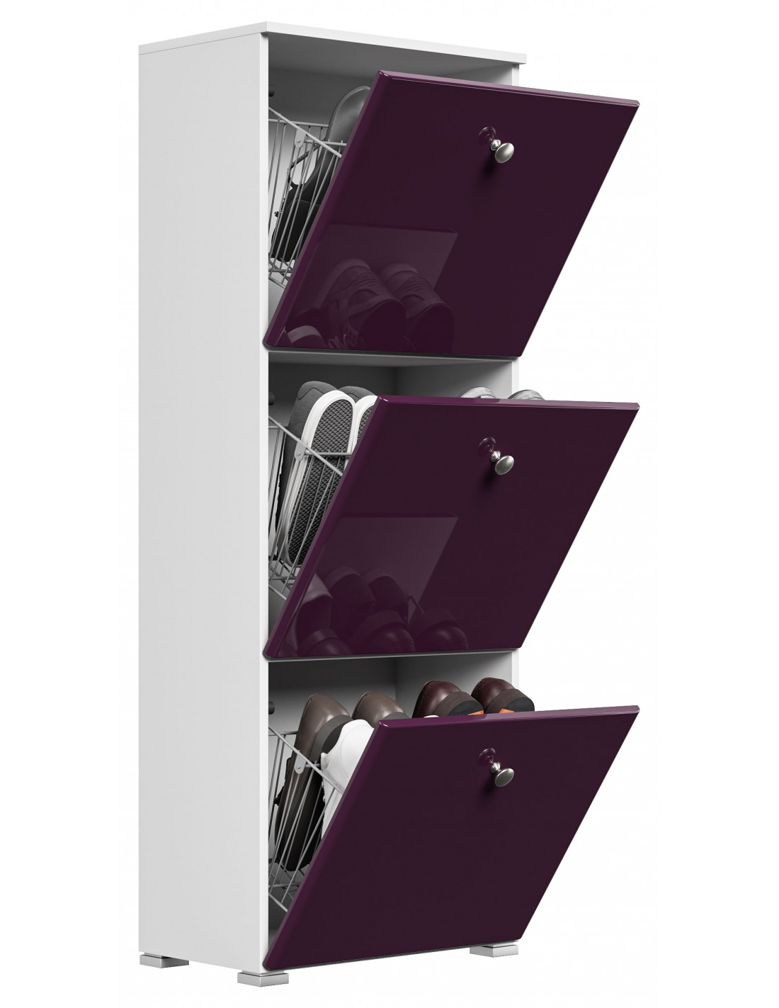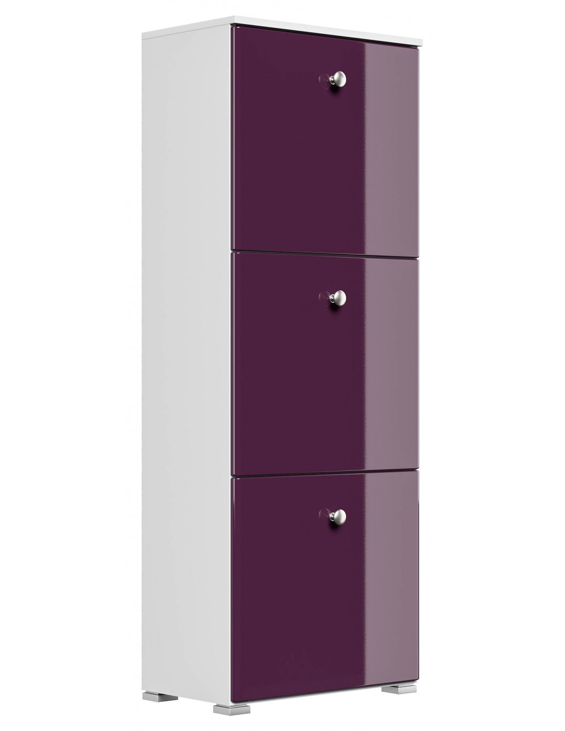 Skoskab udført i et design af mat hvid og brombærfarvet højglans mdf og møbelplade. Skoskabet måler 141,5 cm i højden og 52,4 x 31,6 cm i bredde og dybde.