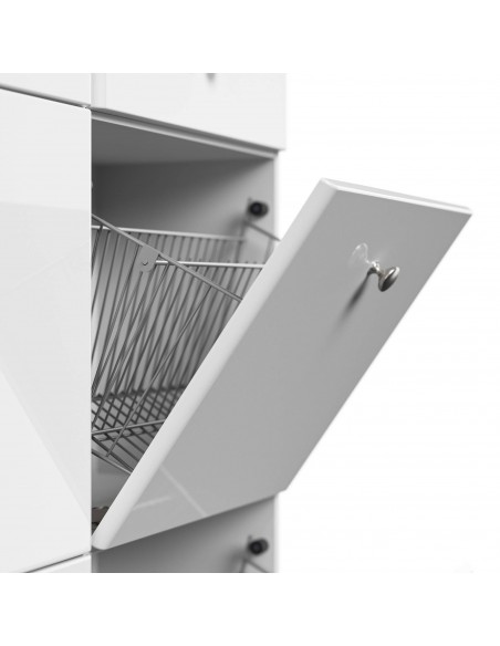 Skoskab udført i et design af mat hvid og hvid højglans mdf og møbelplade. Skoskabet måler 113,9 cm i højden og 104,8 x 31,6 cm i bredde og dybde.