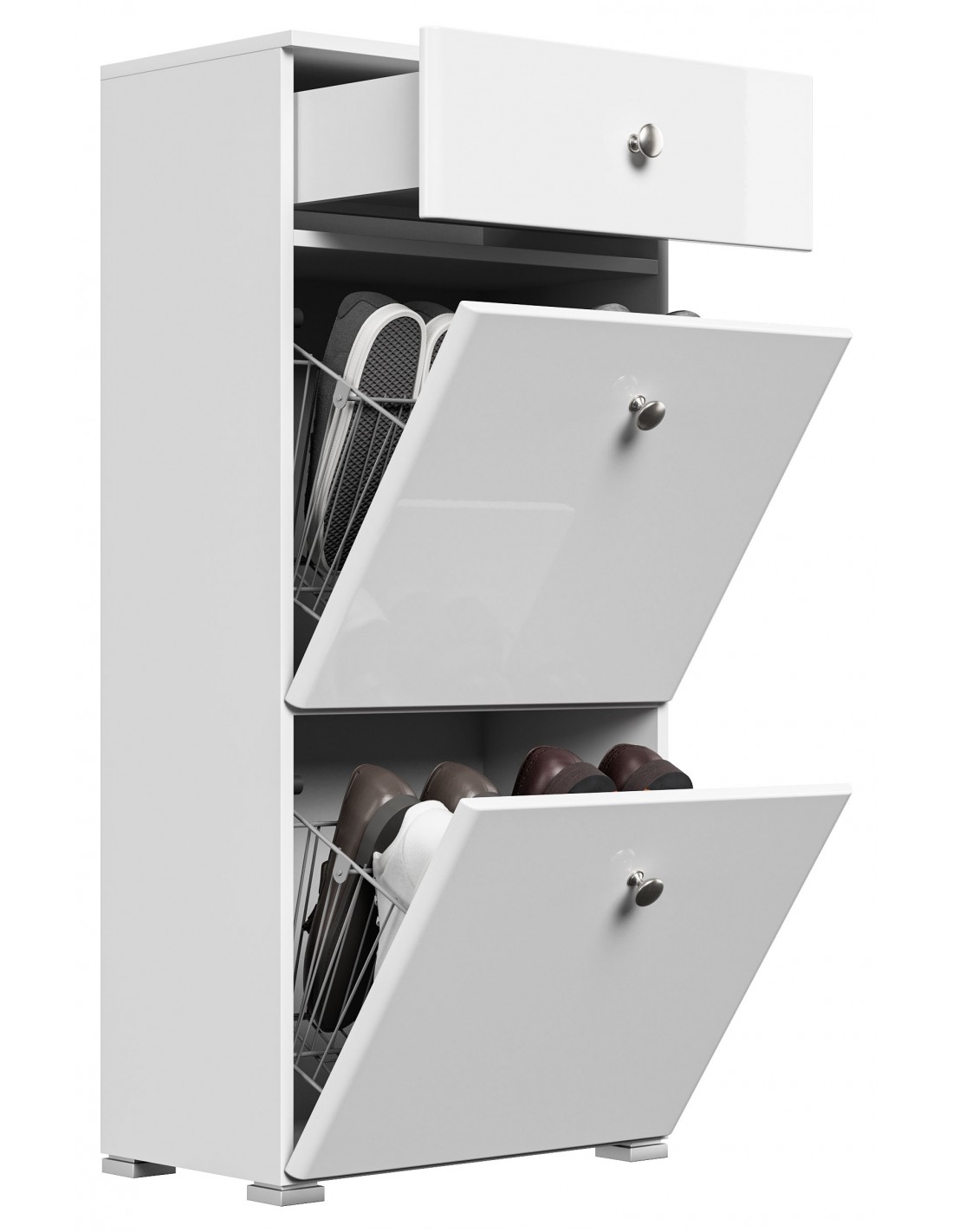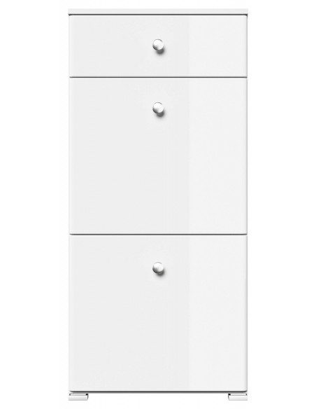 Skoskab udført i et design af mat hvid og hvid højglans mdf og møbelplade. Skoskabet måler 113,9 cm i højden og 52,4 x 31,6 cm i bredde og dybde.
