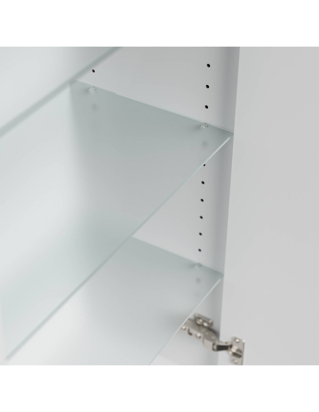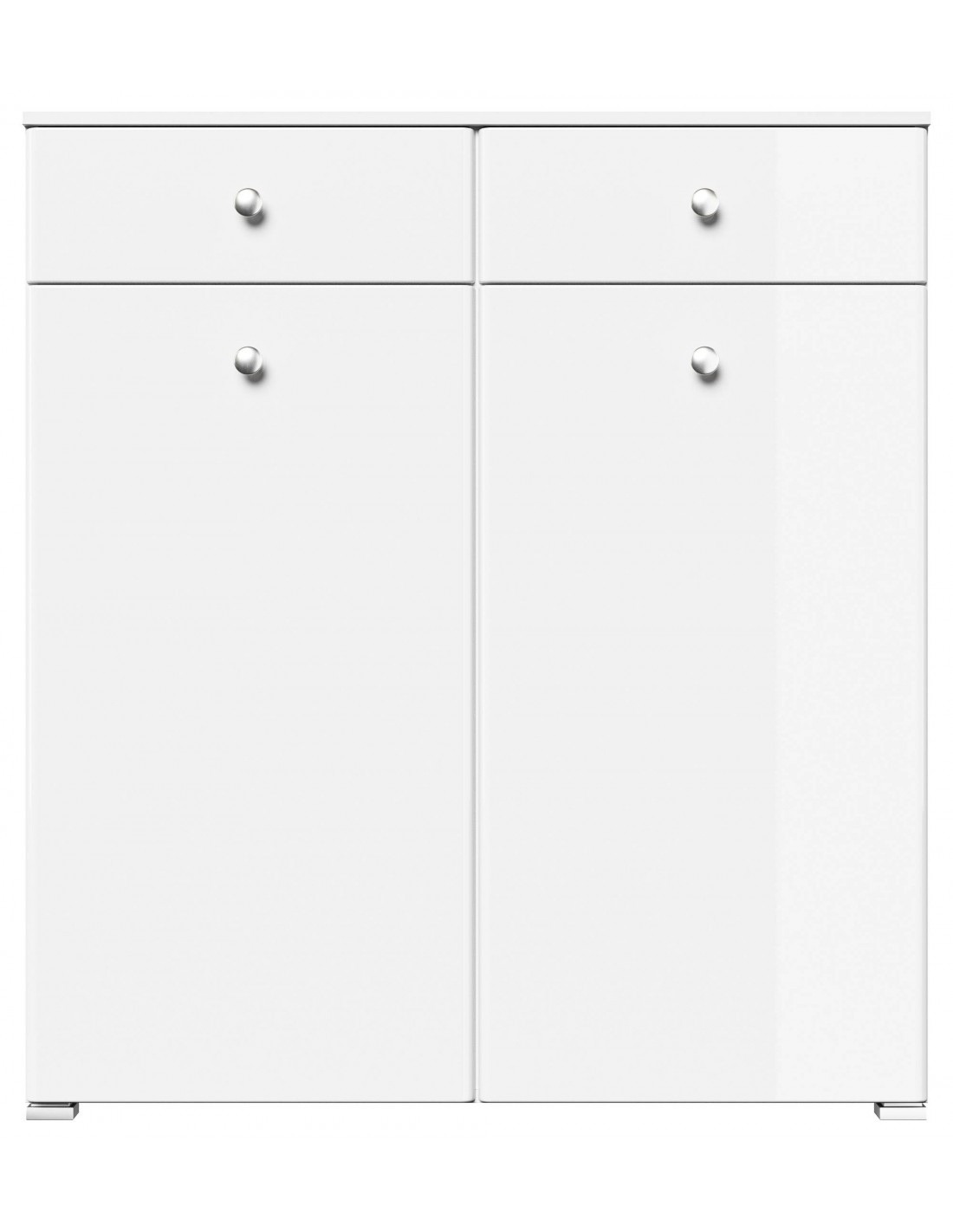 Skoskab udført i et design af mat hvid og hvid højglans mdf og møbelplade. Skoskabet måler 116,8 cm i højden og 104,8 x 36,9 cm i bredde og dybde.