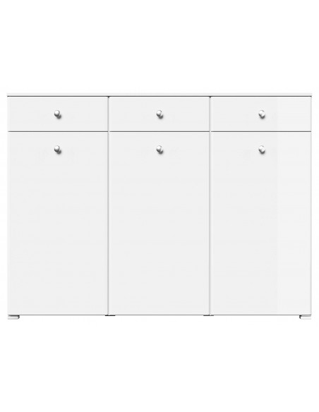 Skoskab udført i et design af mat hvid og hvid højglans mdf og møbelplade. Skoskabet måler 116,8 cm i højden og 157,2 x 36,9 cm i bredde og dybde.