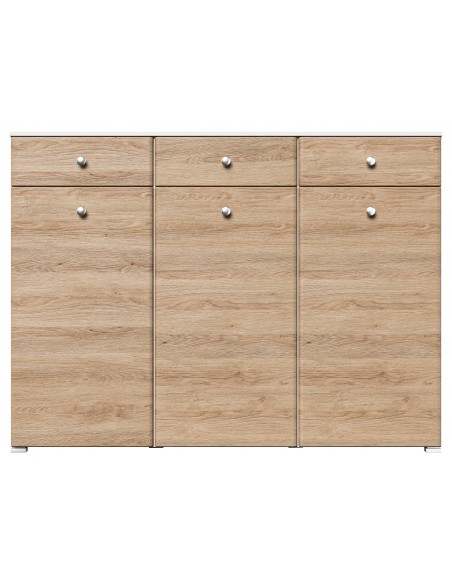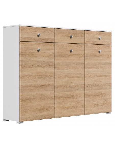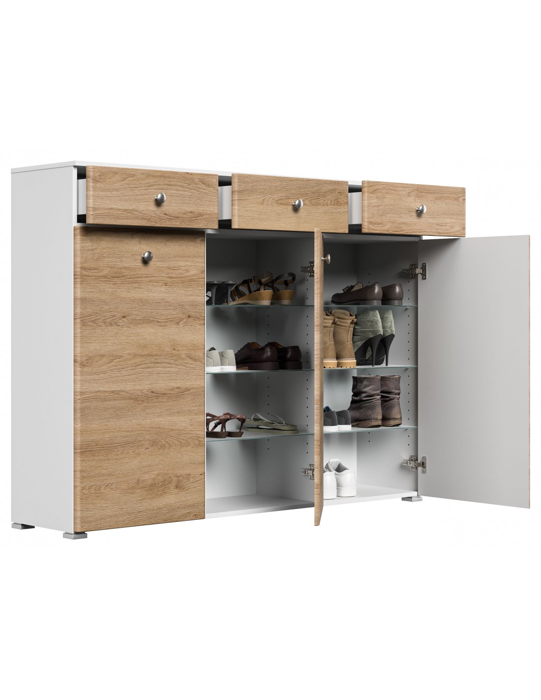 Skoskab udført i et design af mat hvid og egetræsfarvet mdf og møbelplade. Skoskabet måler 116,8 cm i højden og 157,2 x 36,9 cm i bredde og dybde.
