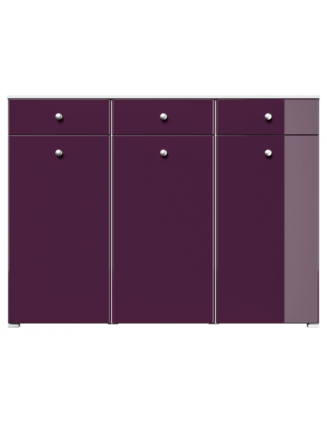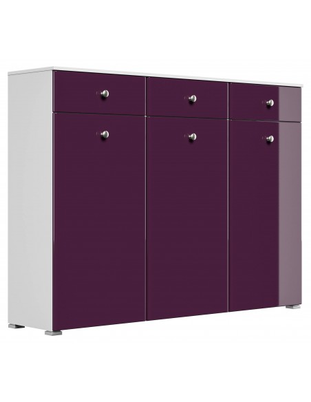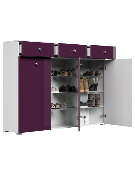Skoskab udført i et design af mat hvid og brombærfarvet højglans mdf og møbelplade. Skoskabet måler 116,8 cm i højden og 157,2 x 36,9 cm i bredde og dybde.
