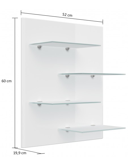 Hylde udført i et design af mdf og glas. Hylden måler 60 cm i højden og 52 x 19,9 cm i bredde og dybde.
