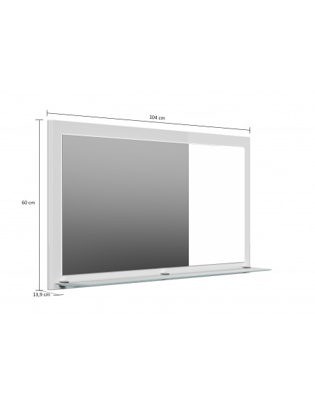 Vægspejl med hylde, udført i et design af mdf og glas. Spejlet måler 60 cm i højden og 104 x 13,9 cm i bredde og dybde.