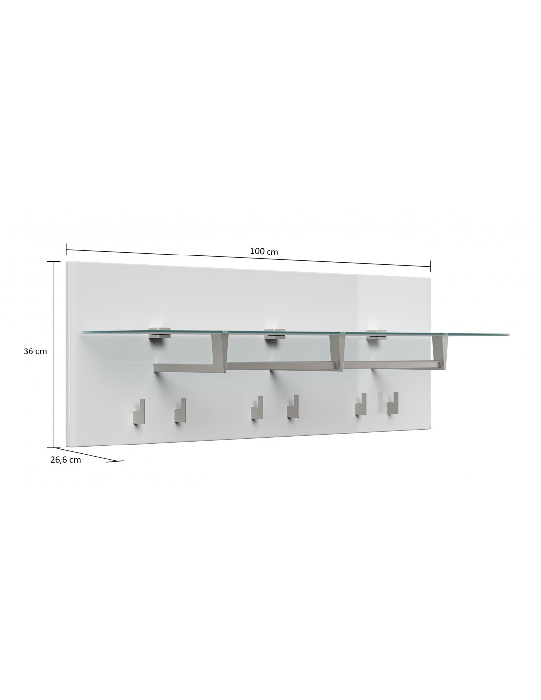 Garderobe med hylde og knager, udført i et design af mdf og glas. Garderoben måler 36 cm i højden og 100 x 26,6 cm i bredde og dybde.