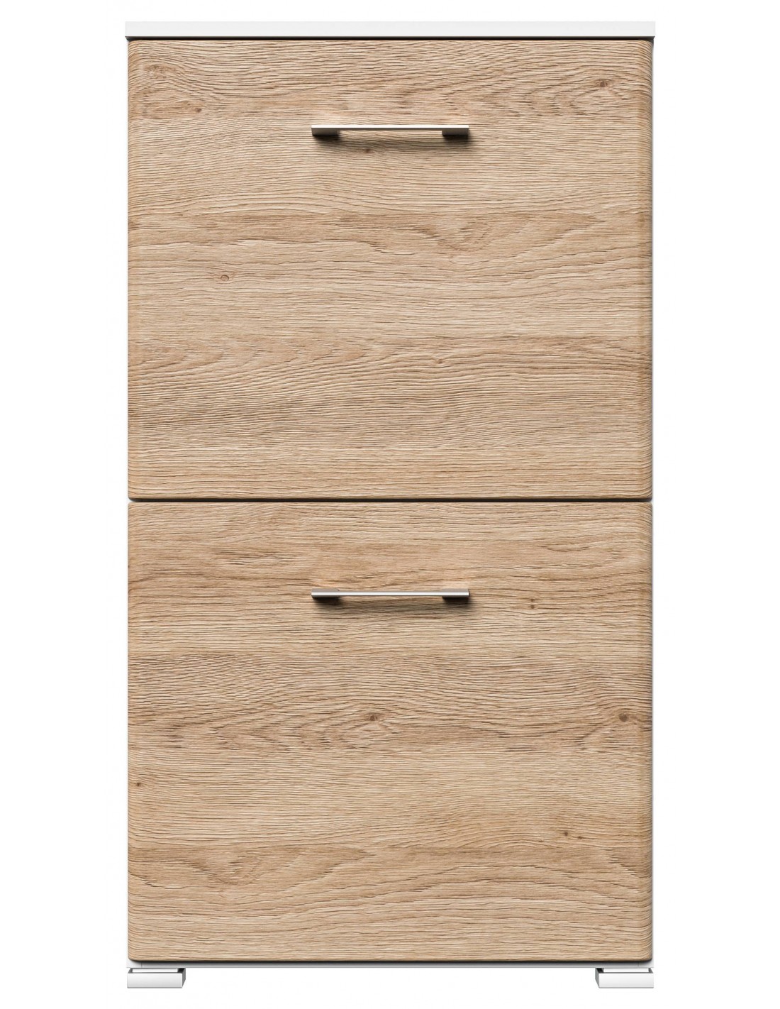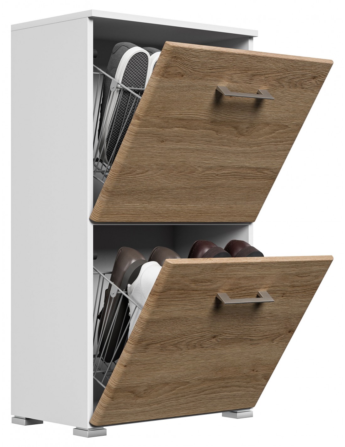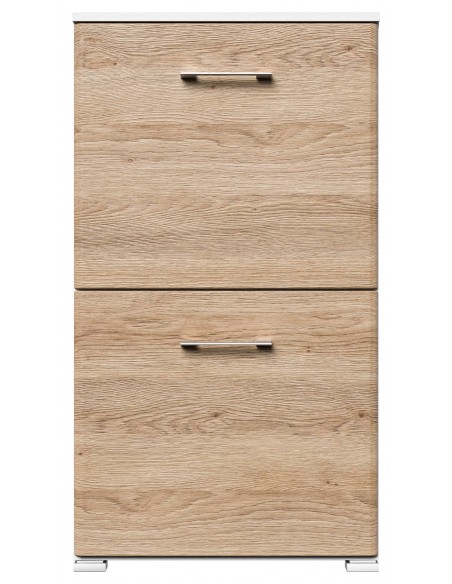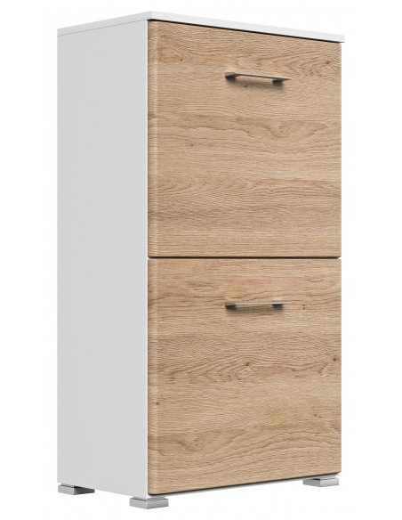 Skoskab udført i et design af mat hvid og egetræsfarvet mdf og møbelplade. Skoskabet måler 95,7 cm i højden og 52,4 x 31,6 cm i bredde og dybde.