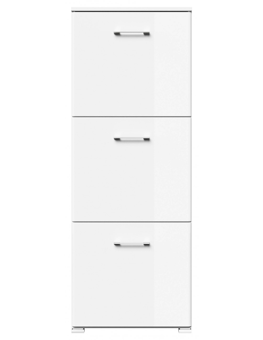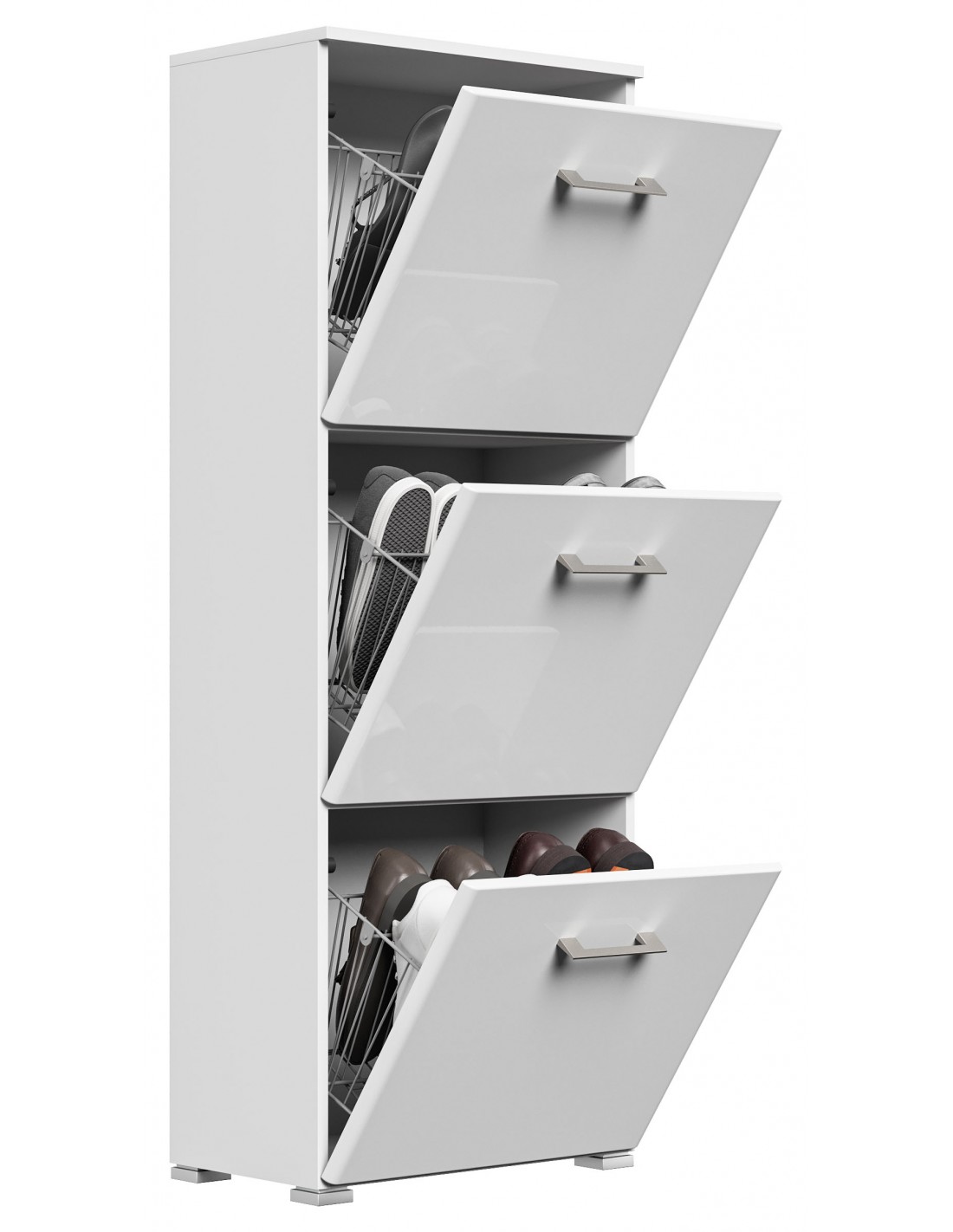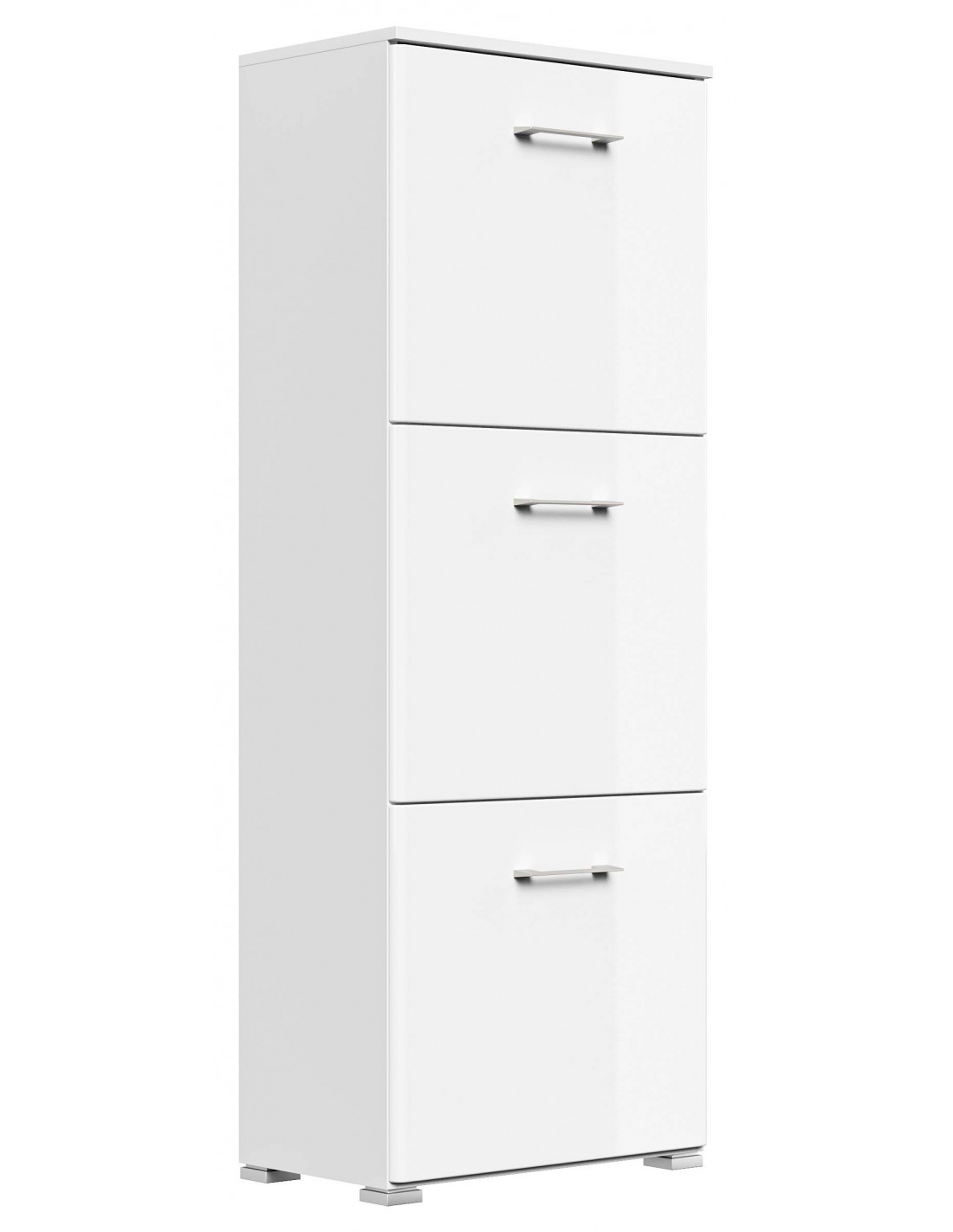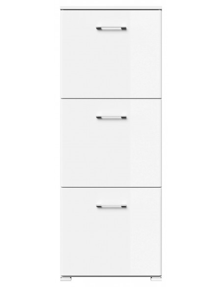 Skoskab udført i et design af mat hvid og hvid højglans mdf og møbelplade. Skoskabet måler 141,5 cm i højden og 52,4 x 31,6 cm i bredde og dybde.