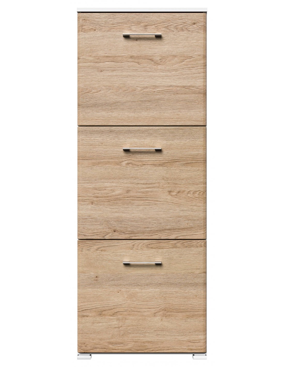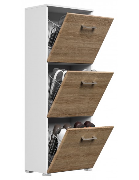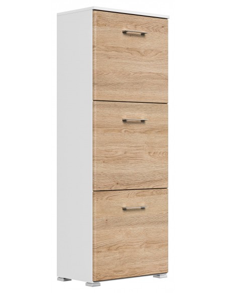 Skoskab udført i et design af mat hvid og egetræsfarvet mdf og møbelplade. Skoskabet måler 141,5 cm i højden og 52,4 x 31,6 cm i bredde og dybde.