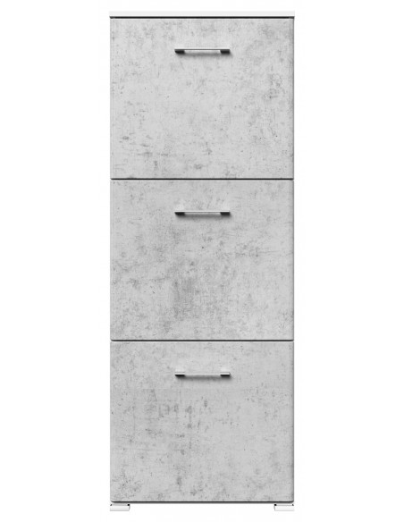 Skoskab udført i et design af mat hvid og betongrå mdf og møbelplade. Skoskabet måler 141,5 cm i højden og 52,4 x 31,6 cm i bredde og dybde.