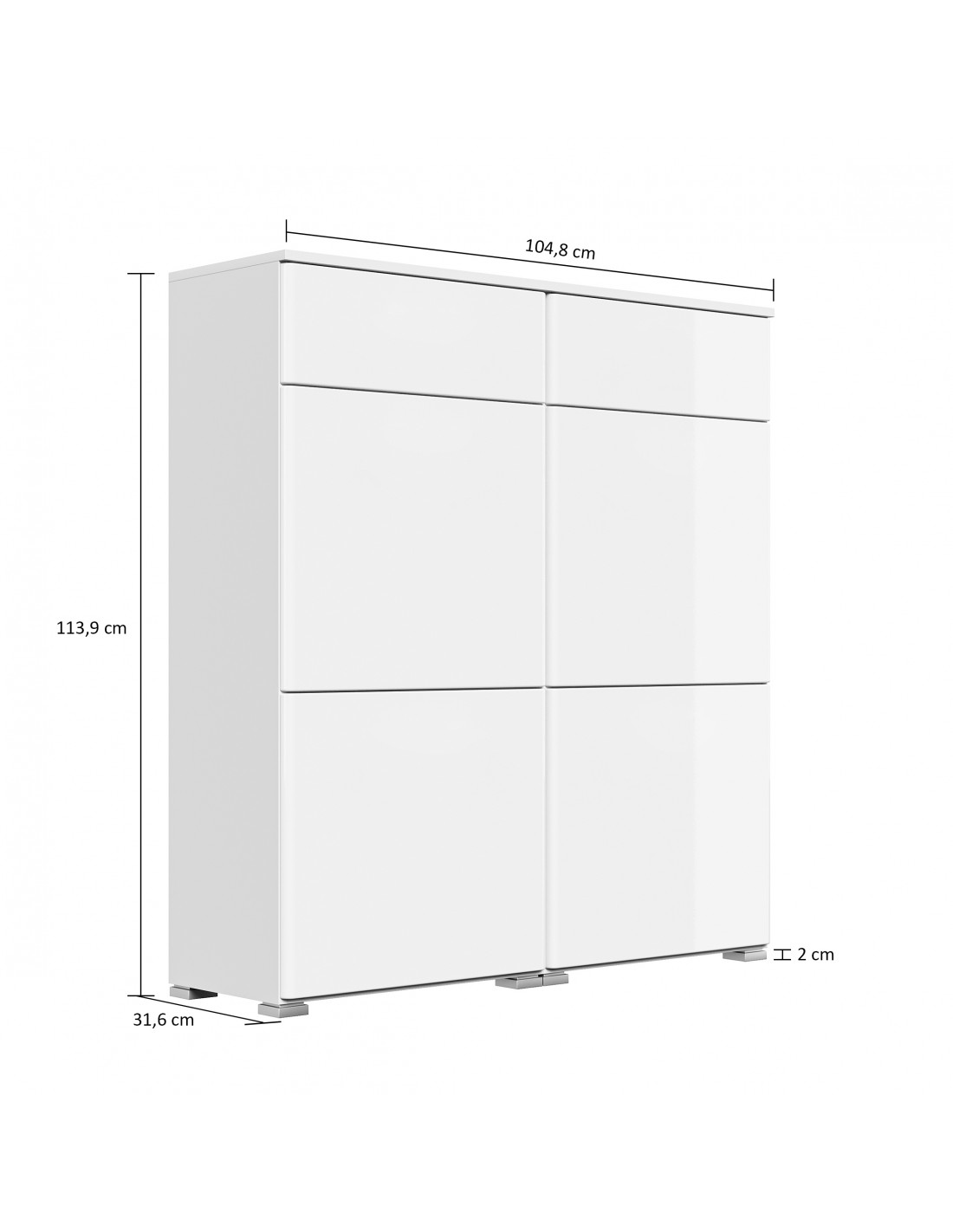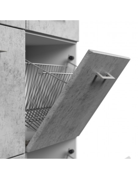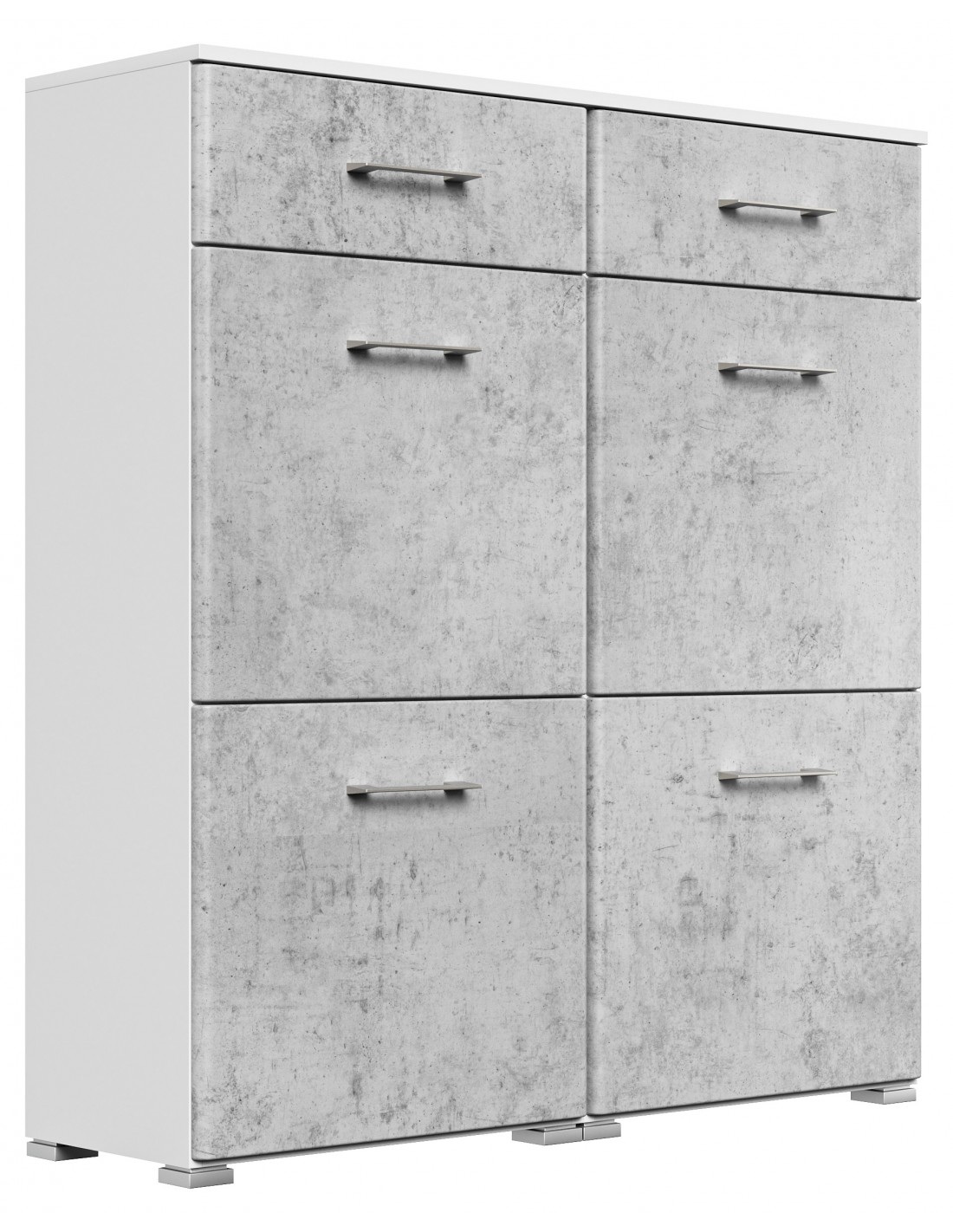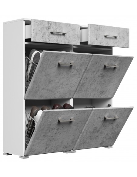 Skoskab udført i et design af mat hvid og betongrå mdf og møbelplade. Skoskabet måler 113,9 cm i højden og 104,8 x 31,6 cm i bredde og dybde.