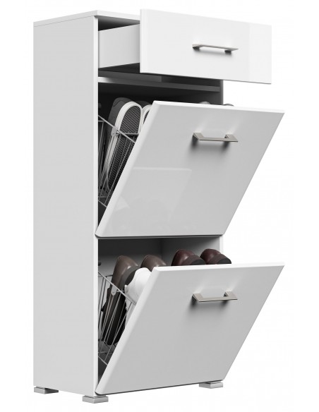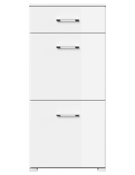 Skoskab udført i et design af mat hvid og hvid højglans mdf og møbelplade. Skoskabet måler 113,9 cm i højden og 52,4 x 31,6 cm i bredde og dybde.