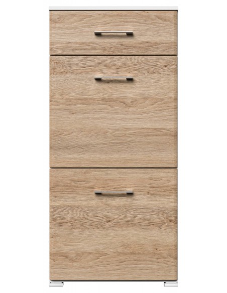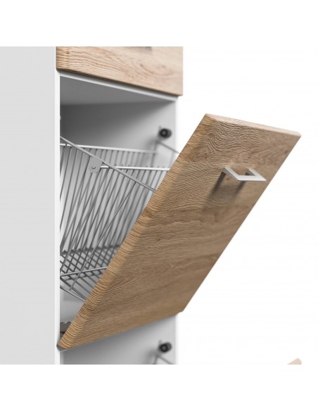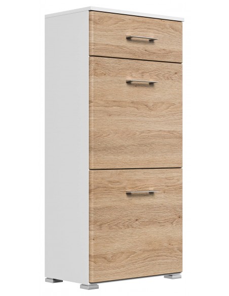 Skoskab udført i et design af mat hvid og egetræsfarvet mdf og møbelplade. Skoskabet måler 113,9 cm i højden og 52,4 x 31,6 cm i bredde og dybde.