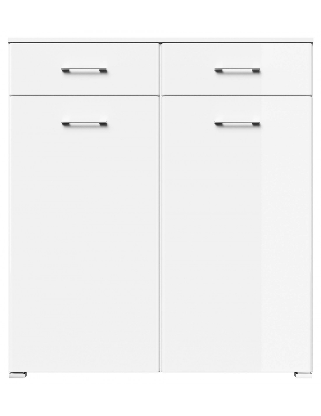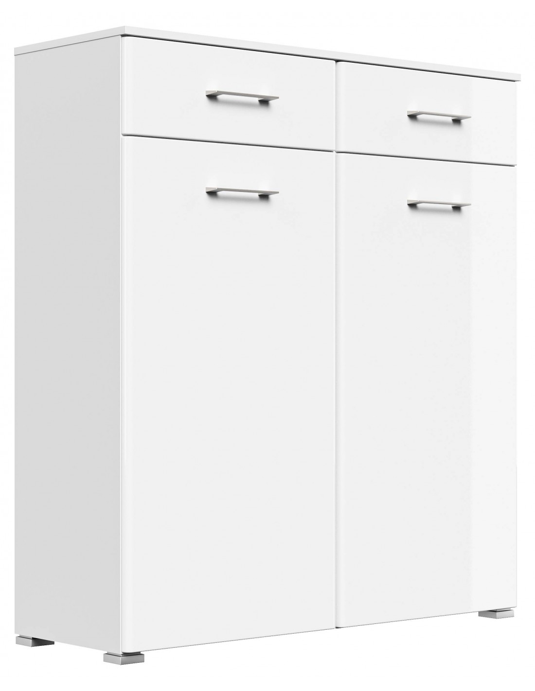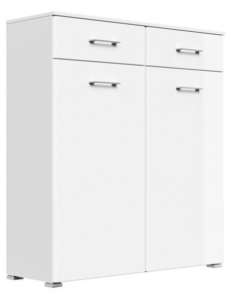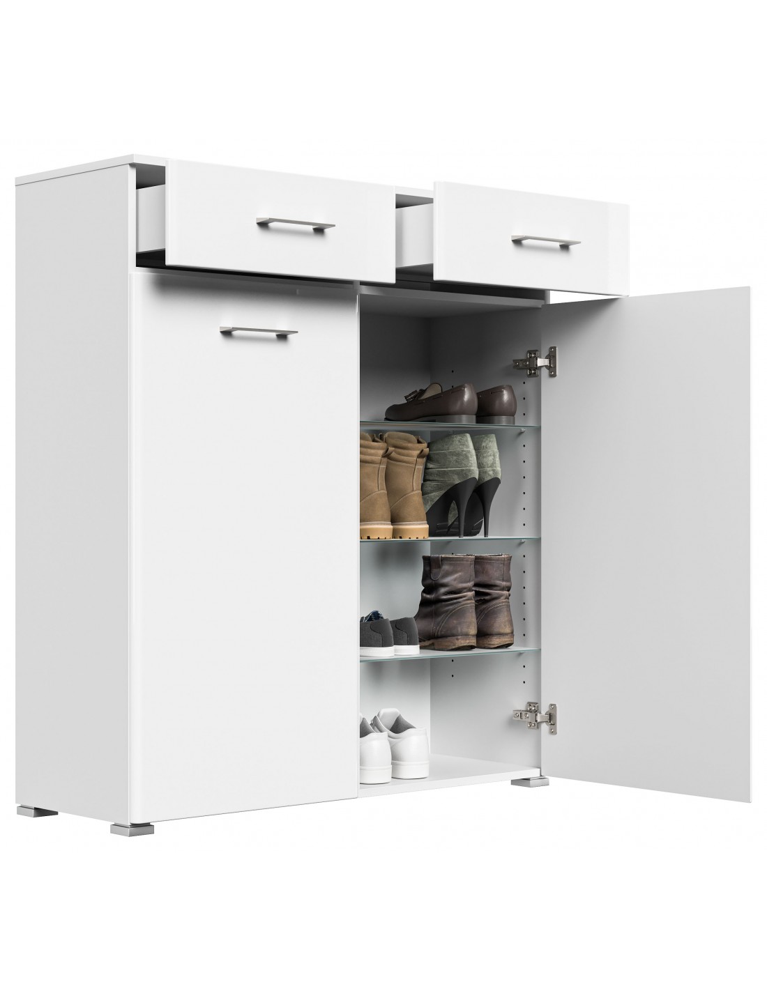 Skoskab udført i et design af mat hvid og hvid højglans mdf og møbelplade. Skoskabet måler 116,8 cm i højden og 104,8 x 36,9 cm i bredde og dybde.