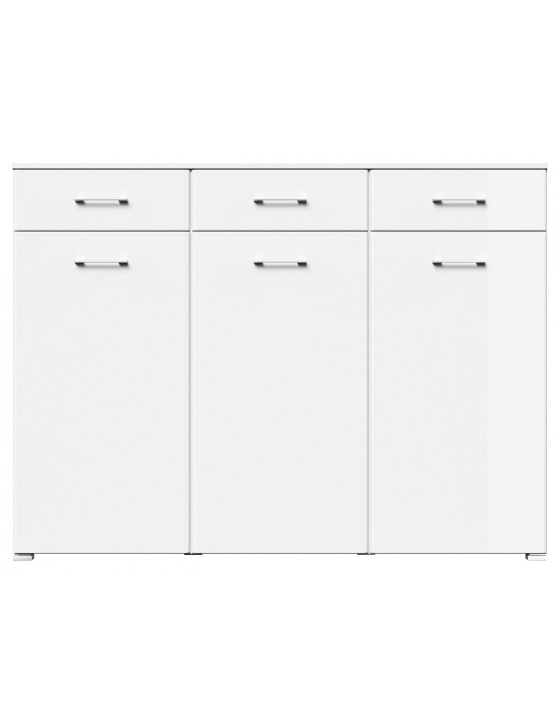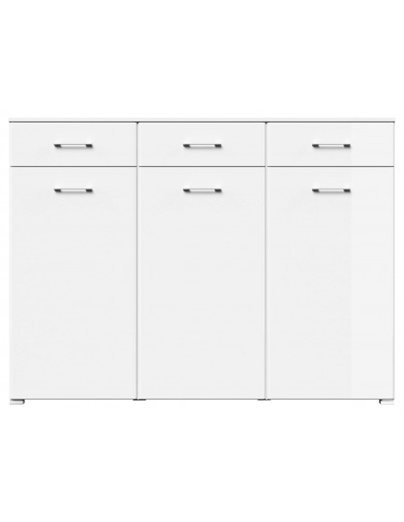Skoskab udført i et design af mat hvid og hvid højglans mdf og møbelplade. Skoskabet måler 116,8 cm i højden og 157,2 x 36,9 cm i bredde og dybde.