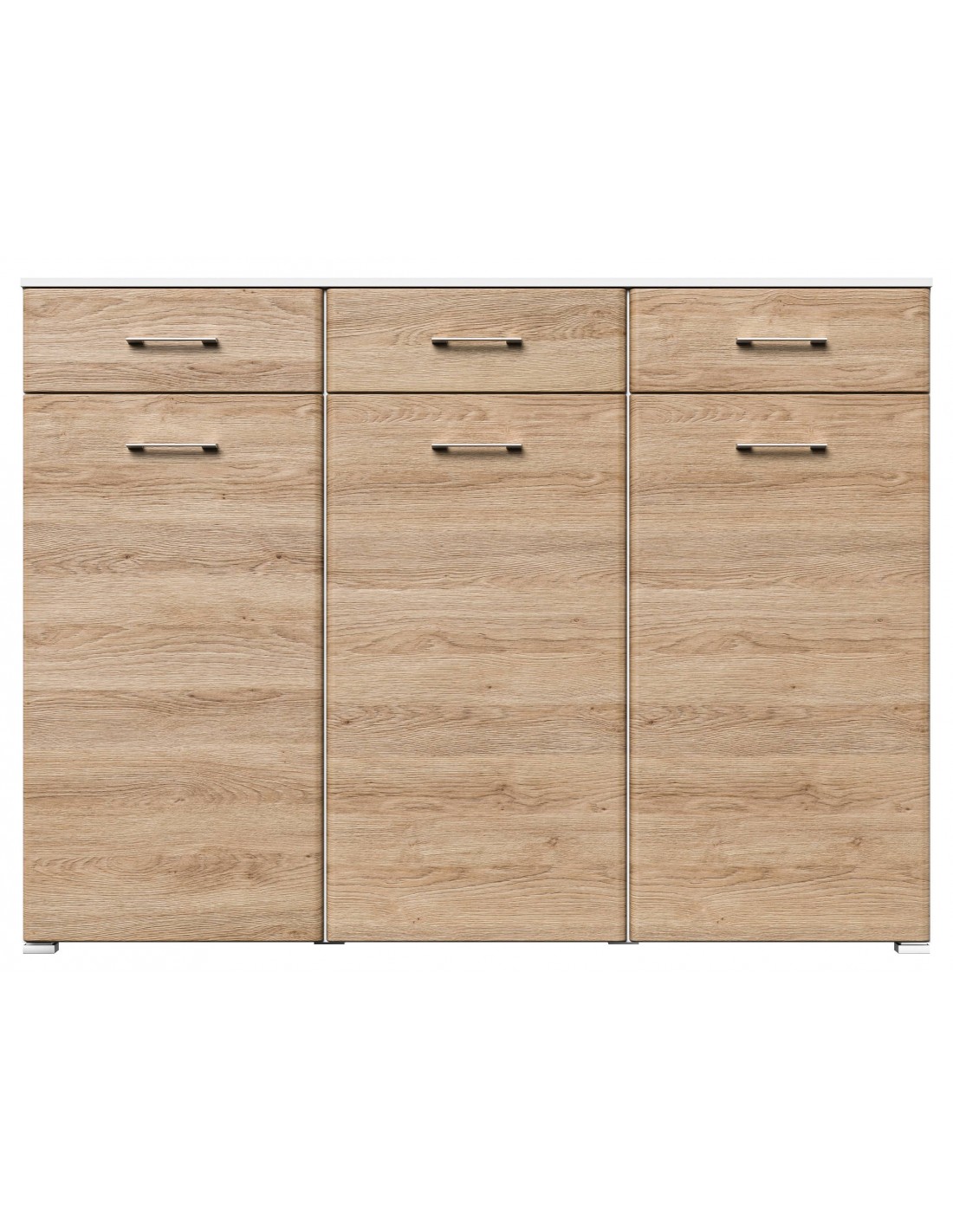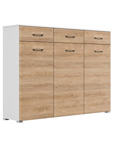 Skoskab udført i et design af mat hvid og egetræsfarvet mdf og møbelplade. Skoskabet måler 116,8 cm i højden og 157,2 x 36,9 cm i bredde og dybde.