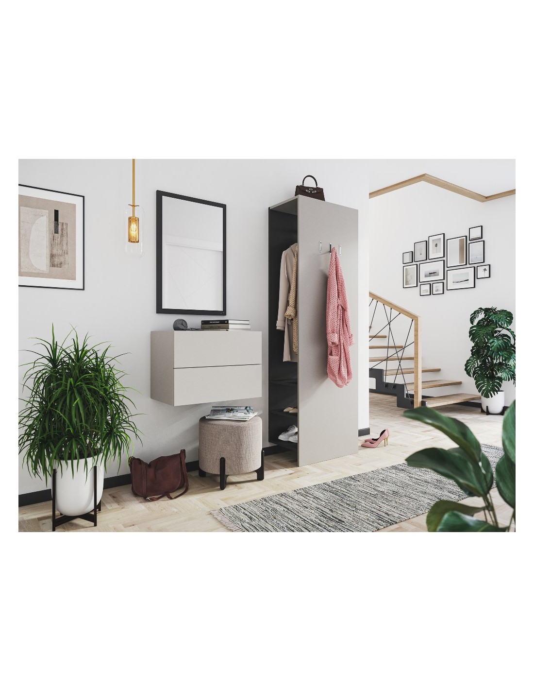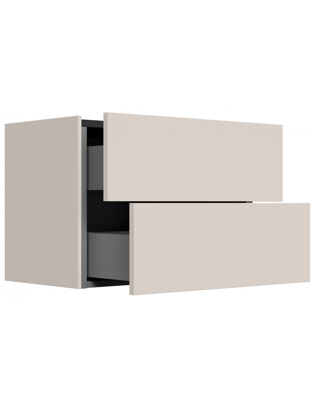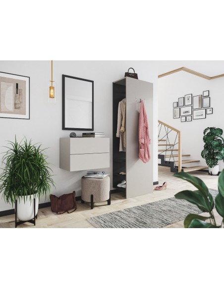 Væghængt garderobe udført i et design af grafitgrå og cremefarvet mdf. Garderoben måler 42,4 cm i højden og 60,4 x 36 cm i bredde og dybde. Skufferne er med push-to-open funktion.