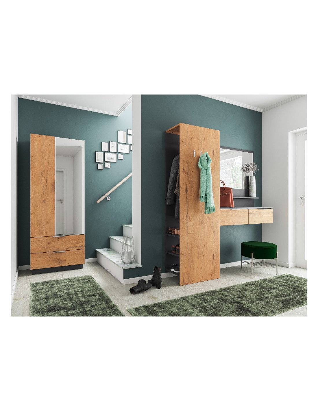 Væghængt garderobeskab udført i et design af grafitgrå og egetræsfarvet mdf. Garderoben måler 23,2 cm i højden og 104,9 x 36,1 cm i bredde og dybde.