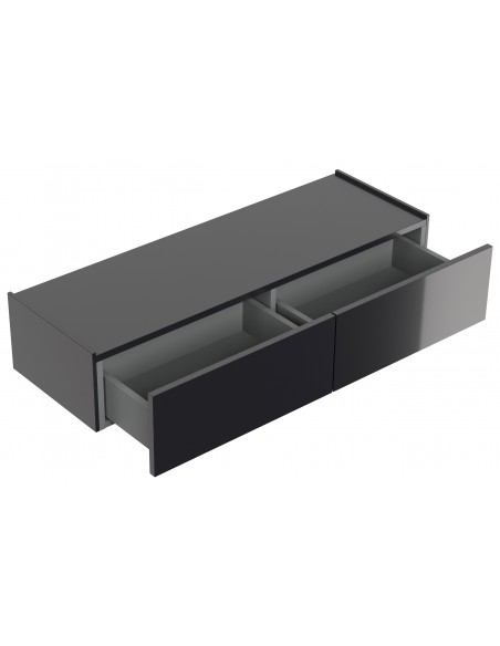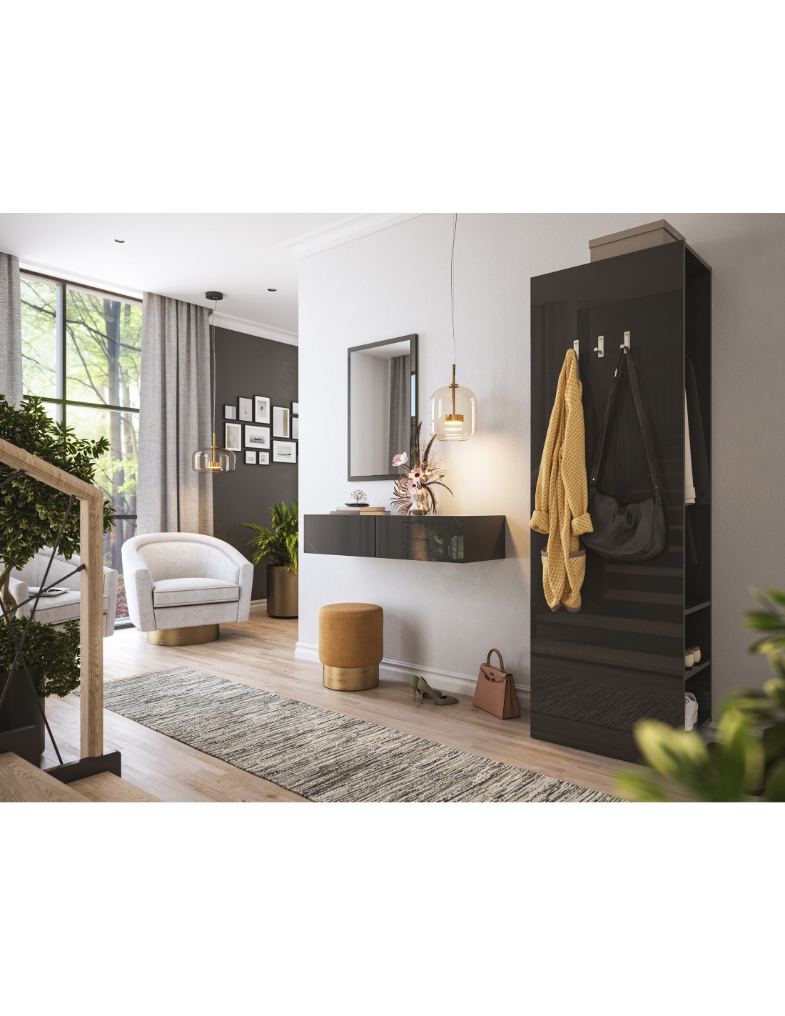 Væghængt garderobe udført i et design af grafitgrå højglans mdf. Garderoben måler 21 cm i højden og 104,7 x 36 cm i bredde og dybde. Skufferne er med push-to-open funktion.