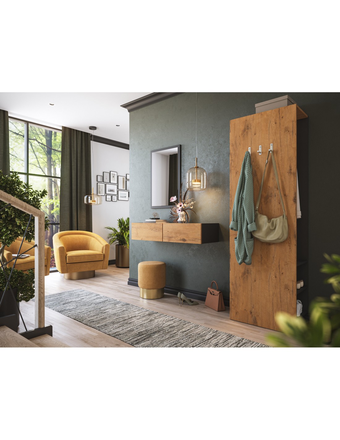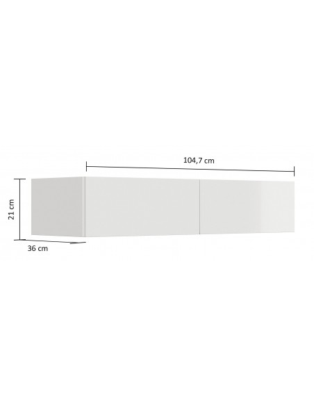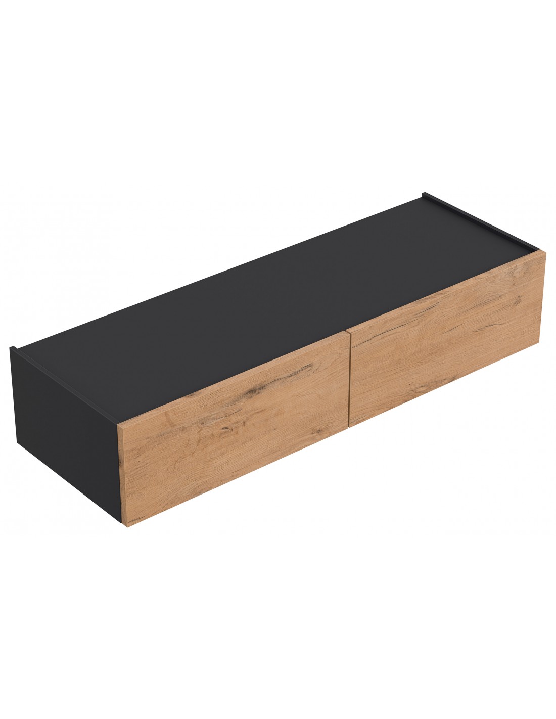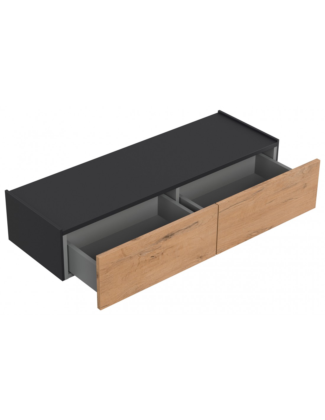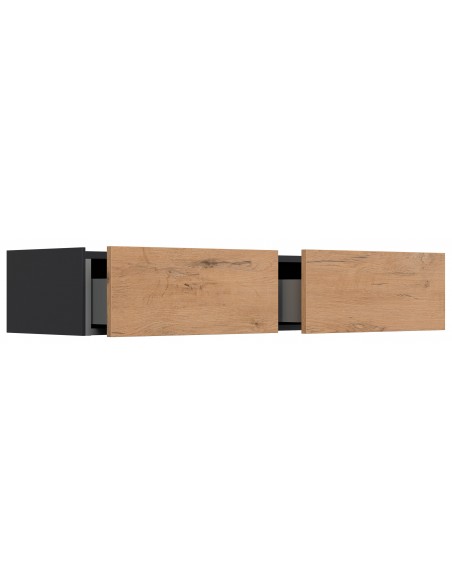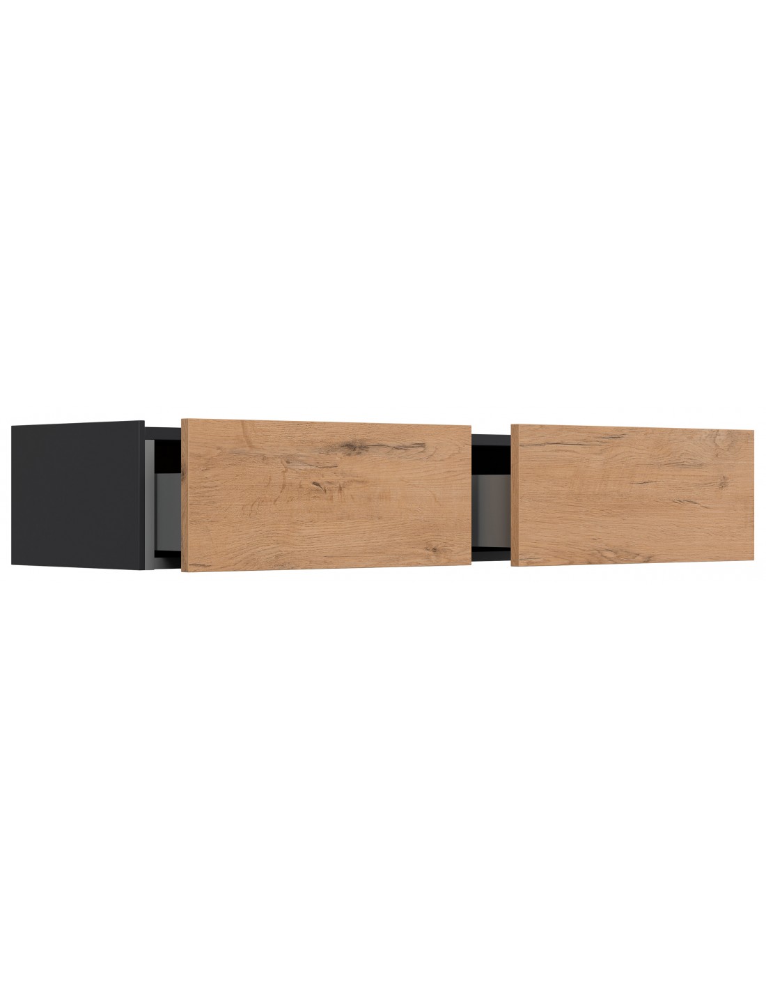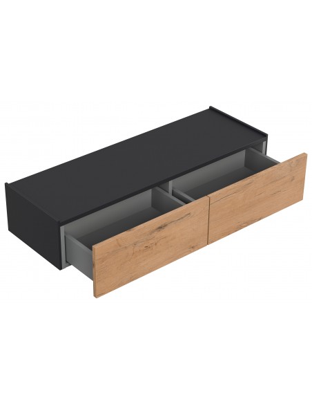 Væghængt garderobe udført i et design af grafitgrå og egetræsfarvet mdf. Garderoben måler 21 cm i højden og 104,7 x 36 cm i bredde og dybde. Skufferne er med push-to-open funktion.