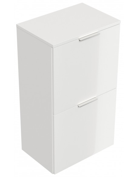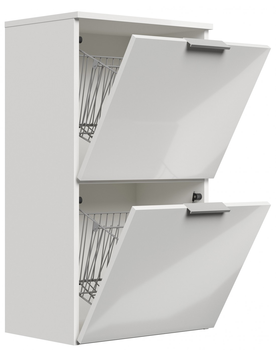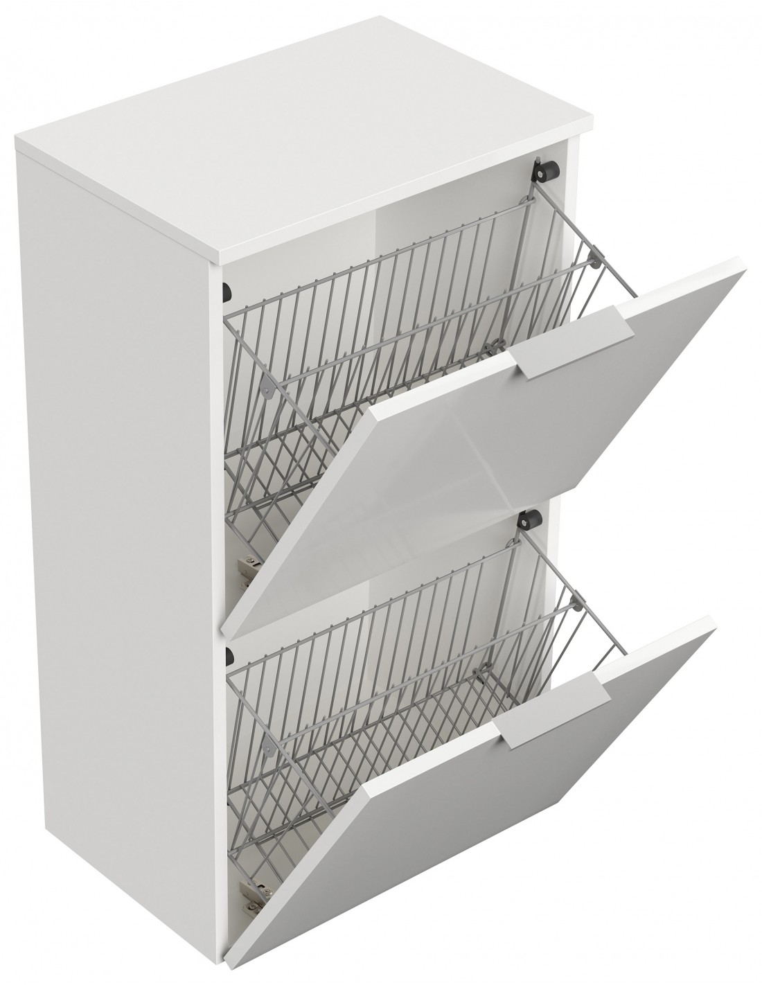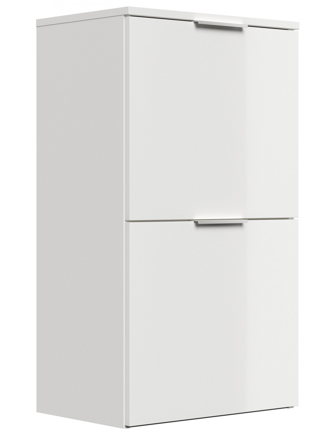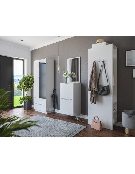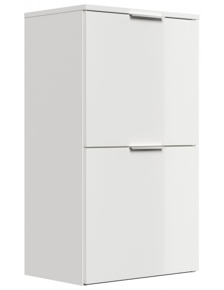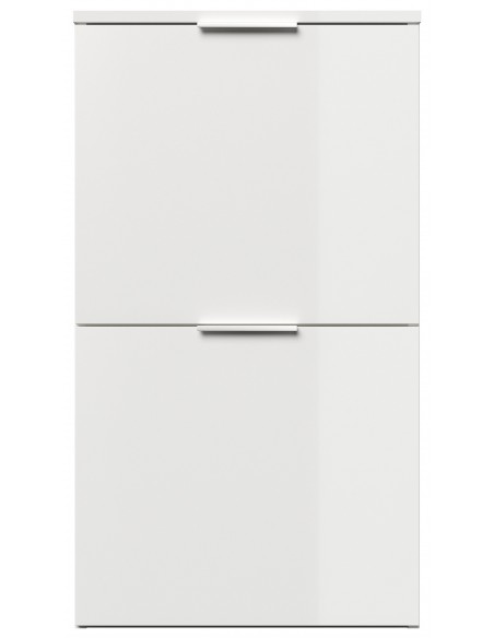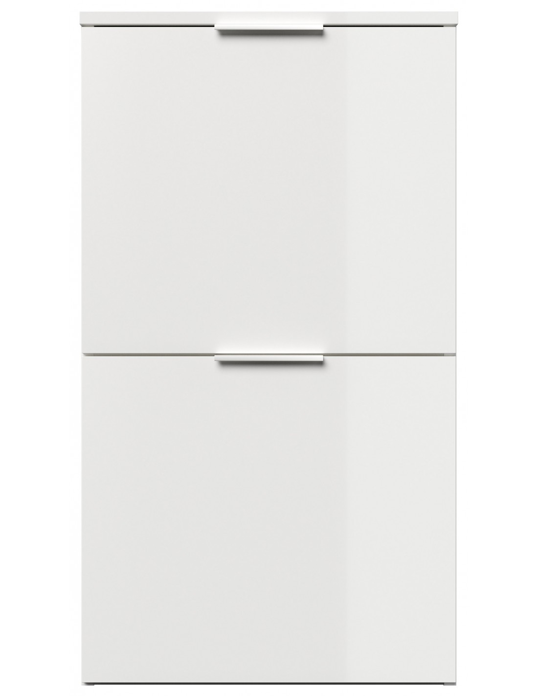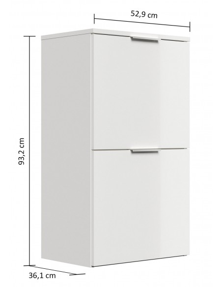 Væghængt skoskab udført i et design af mat hvid og hvid højglans mdf og møbelplade. Skoskabet måler 93,2 cm i højden og 52,9 x 36,1 cm i bredde og dybde.
