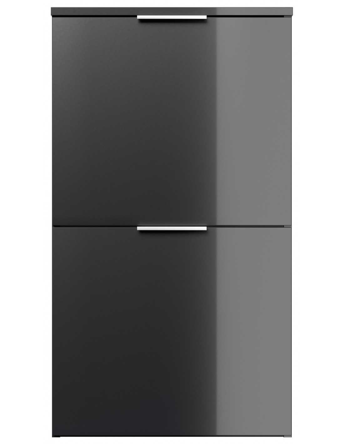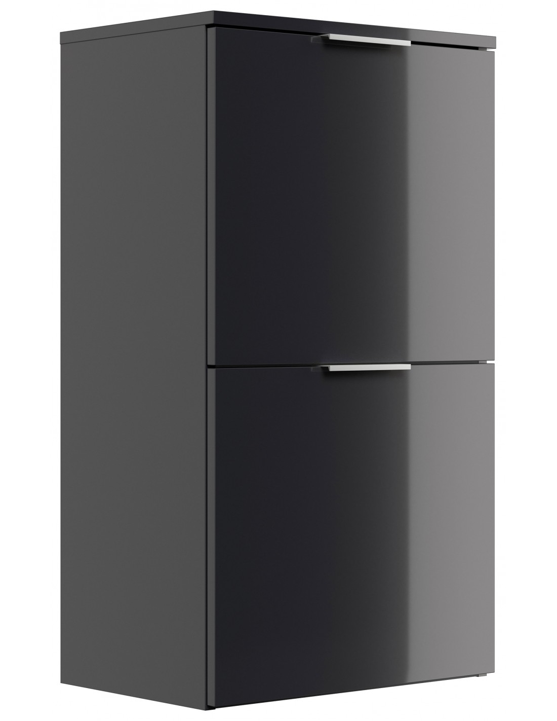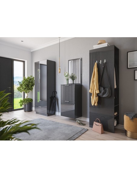 Væghængt skoskab udført i et design af grafitgrå højglans mdf og møbelplade. Skoskabet måler 93,2 cm i højden og 52,9 x 36,1 cm i bredde og dybde.