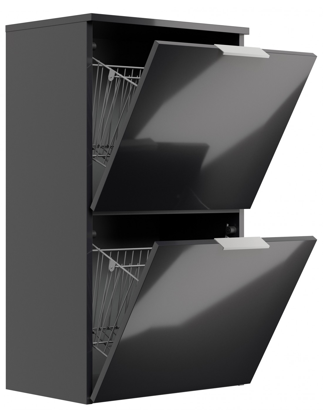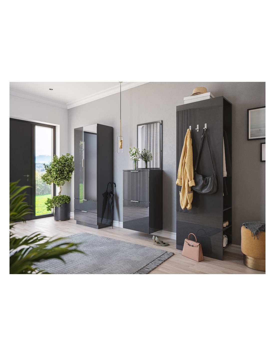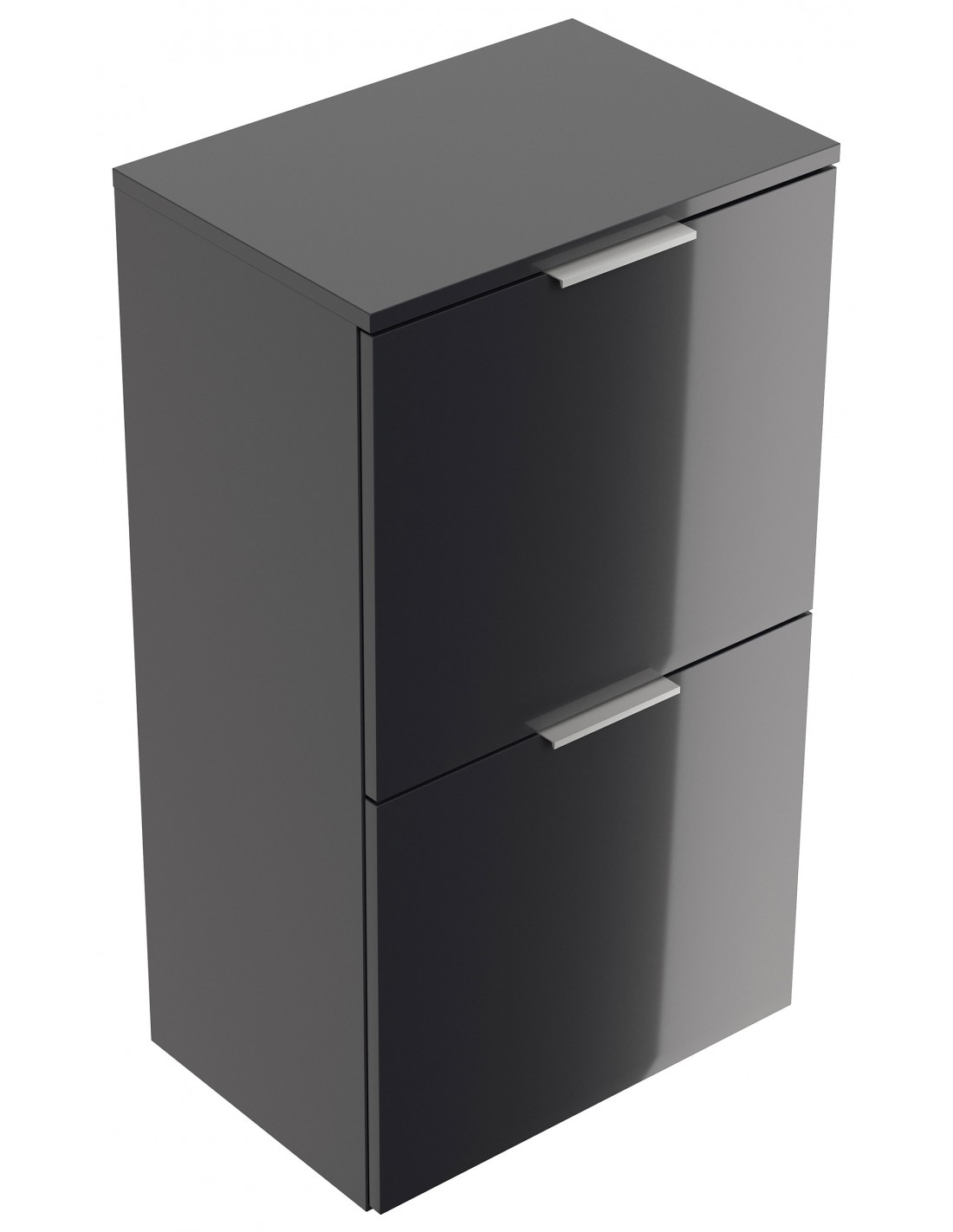 Væghængt skoskab udført i et design af grafitgrå højglans mdf og møbelplade. Skoskabet måler 93,2 cm i højden og 52,9 x 36,1 cm i bredde og dybde.