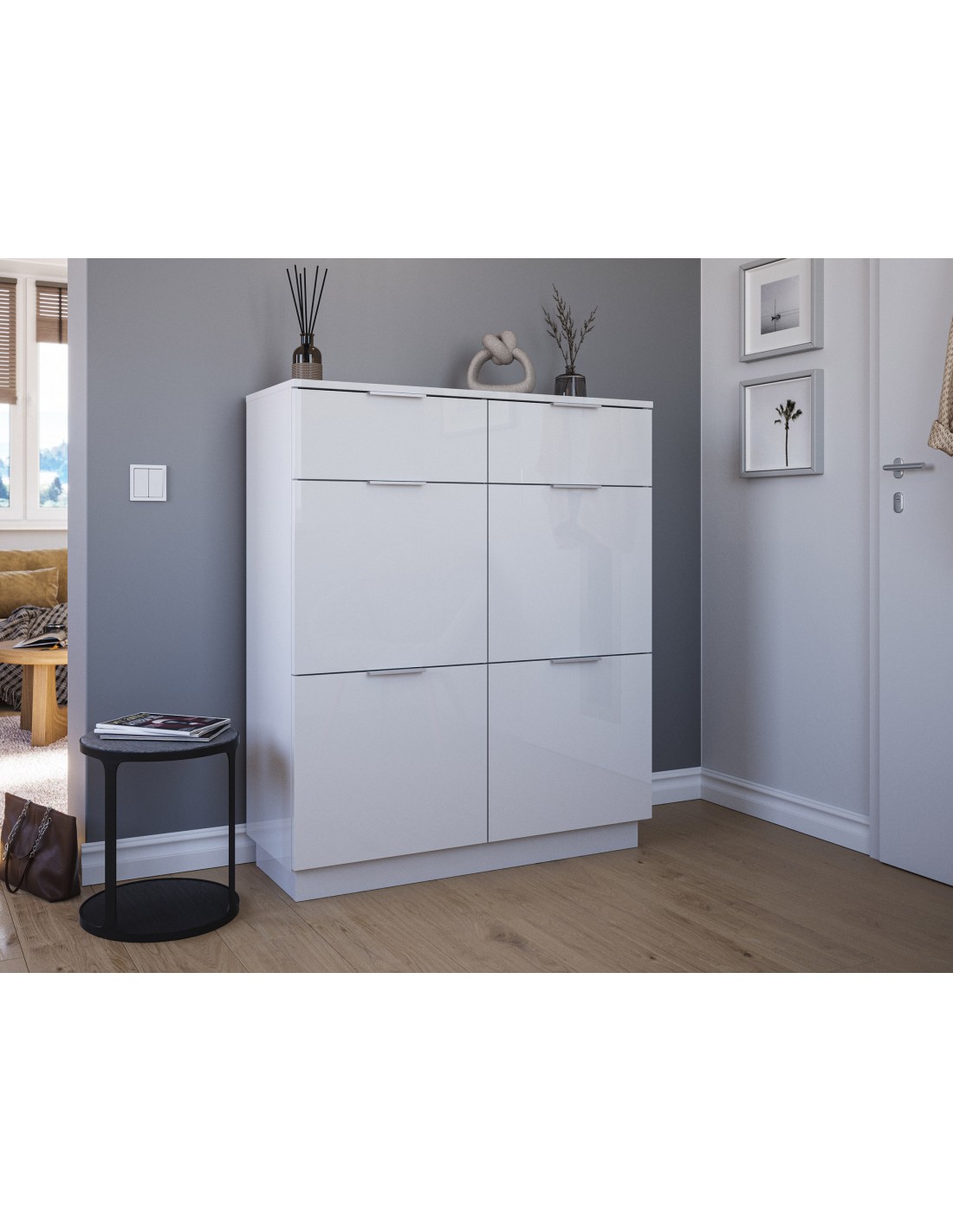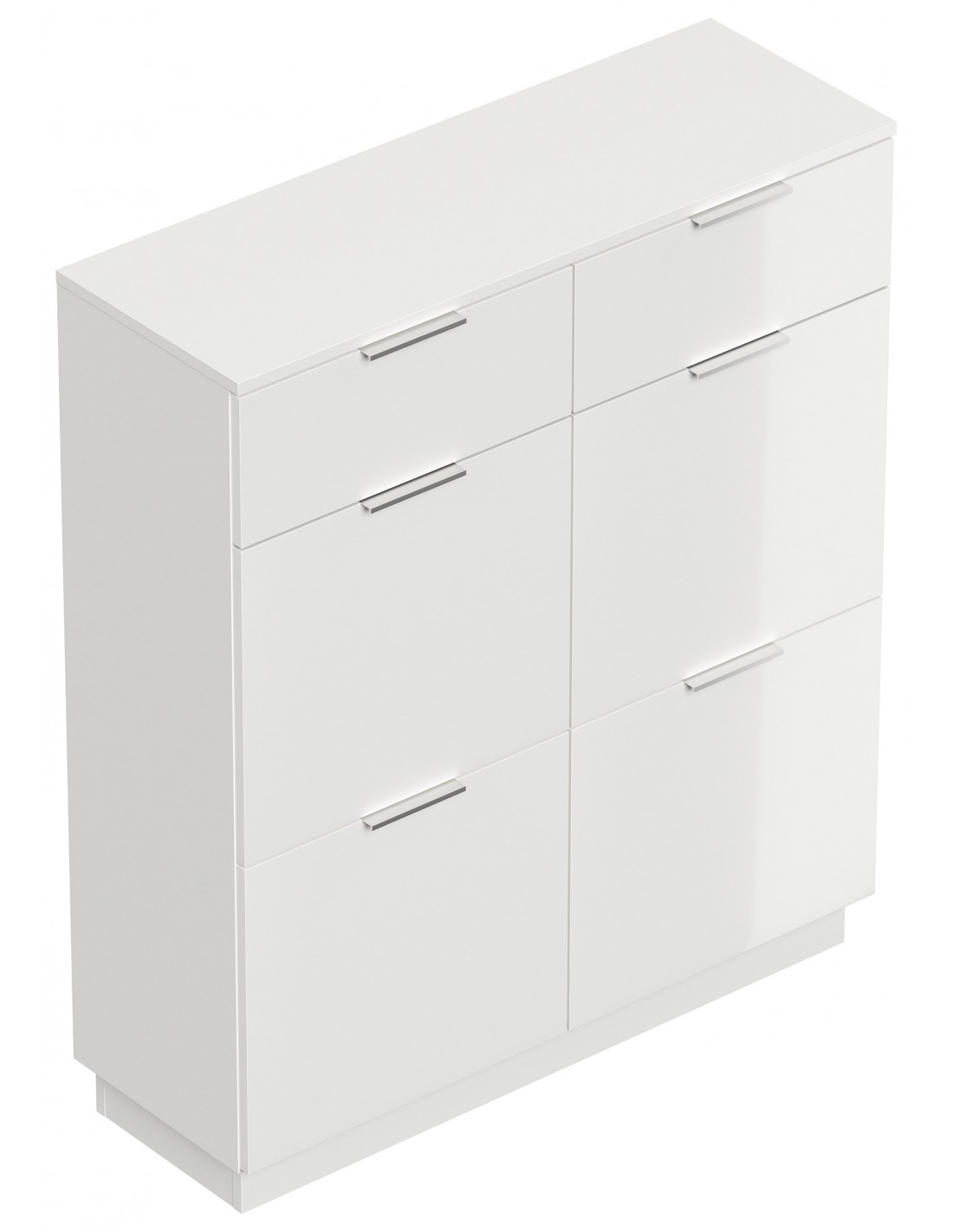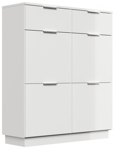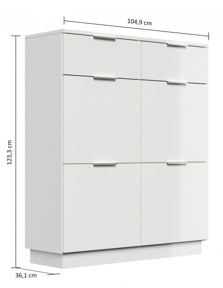 Skoskab udført i et design af mat hvid og hvid højglans mdf og møbelplade. Skoskabet måler 123,3 cm i højden og 104,9 x 36,1 cm i bredde og dybde.