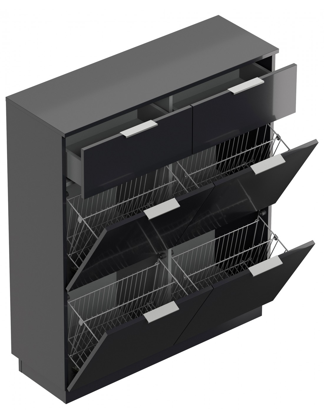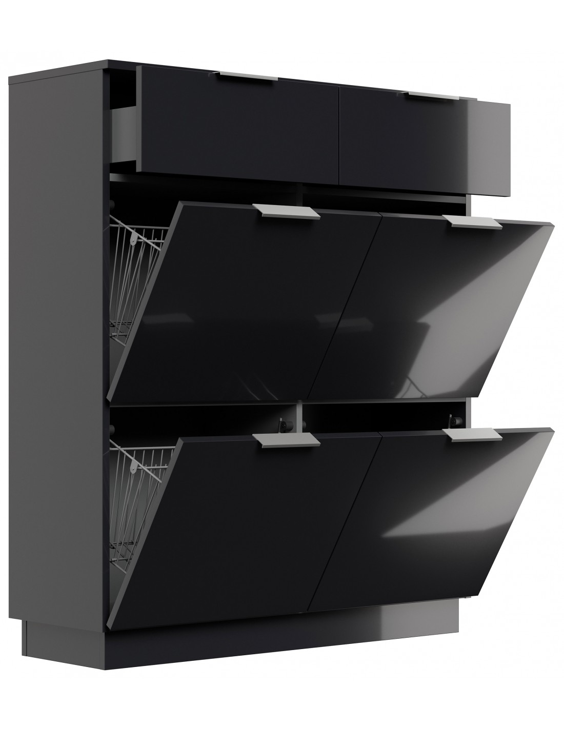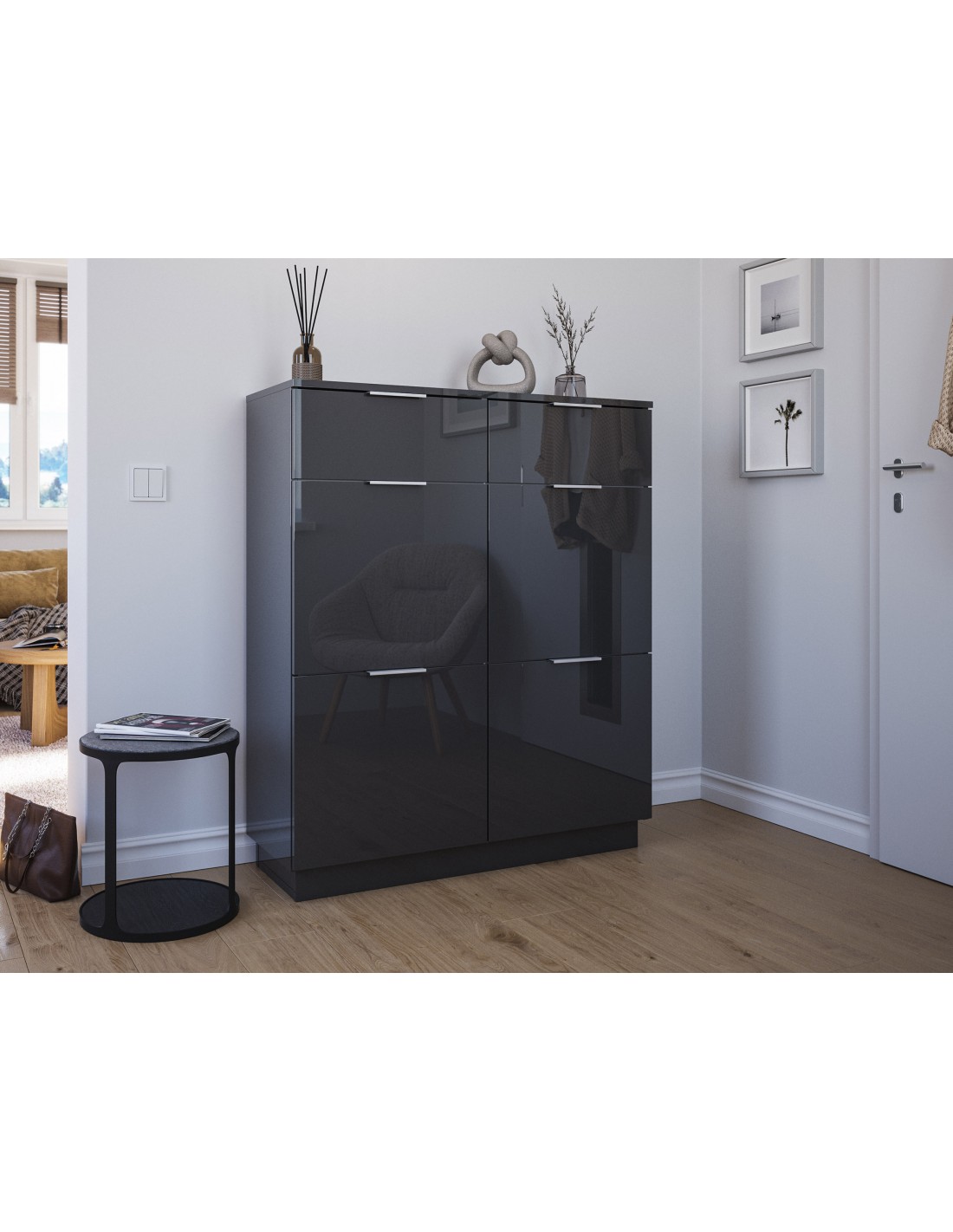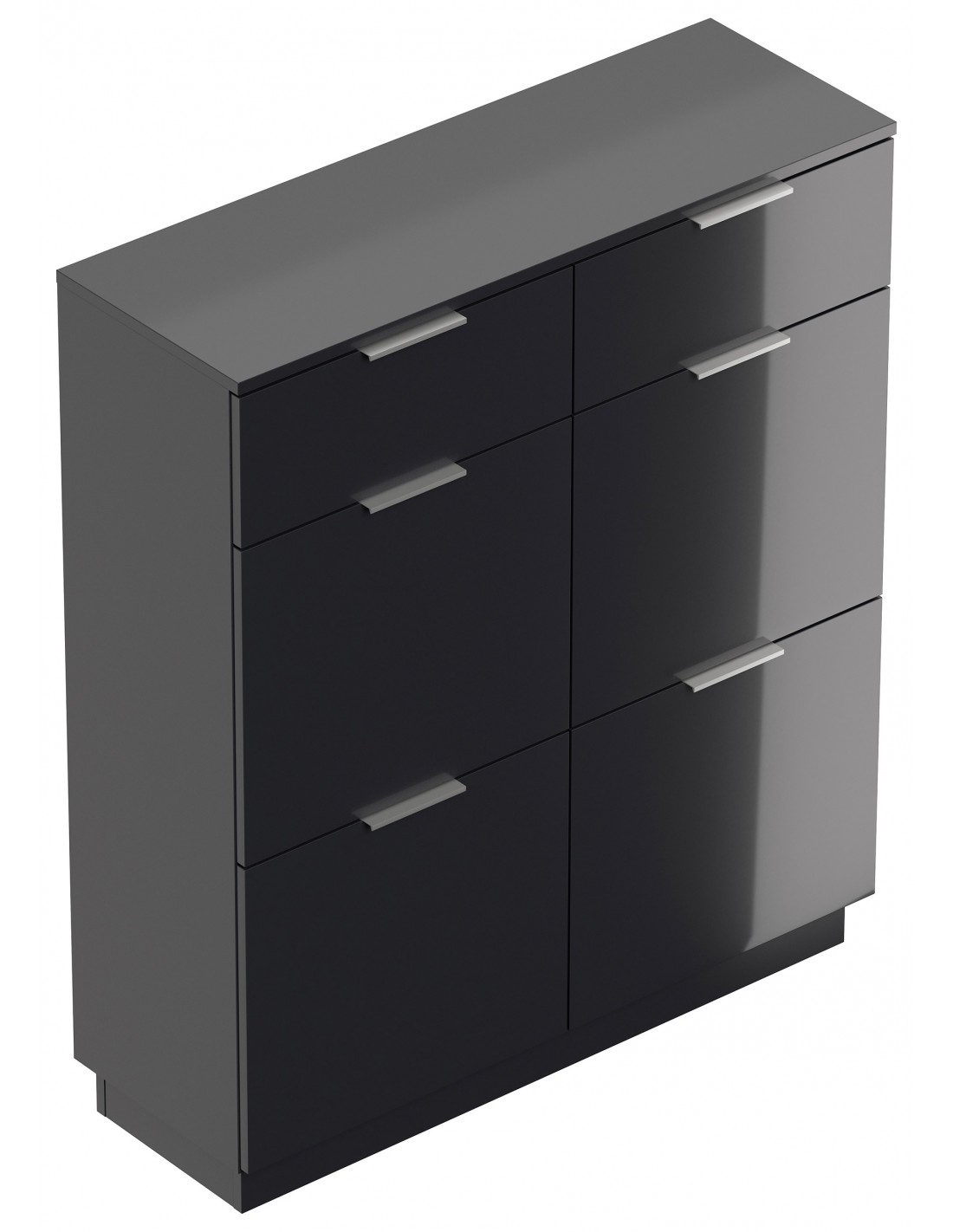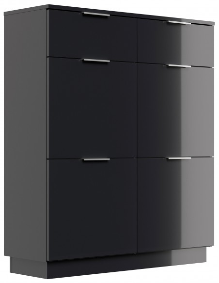 Skoskab udført i et design af grafitgrå højglans mdf og møbelplade. Skoskabet måler 123,3 cm i højden og 104,9 x 36,1 cm i bredde og dybde.