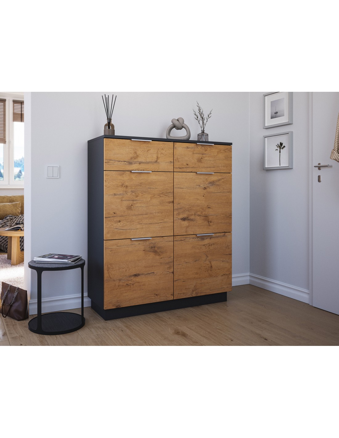 Skoskab udført i et design af grafitgrå og egetræsfarvet mdf og møbelplade. Skoskabet måler 123,3 cm i højden og 104,9 x 36,1 cm i bredde og dybde.