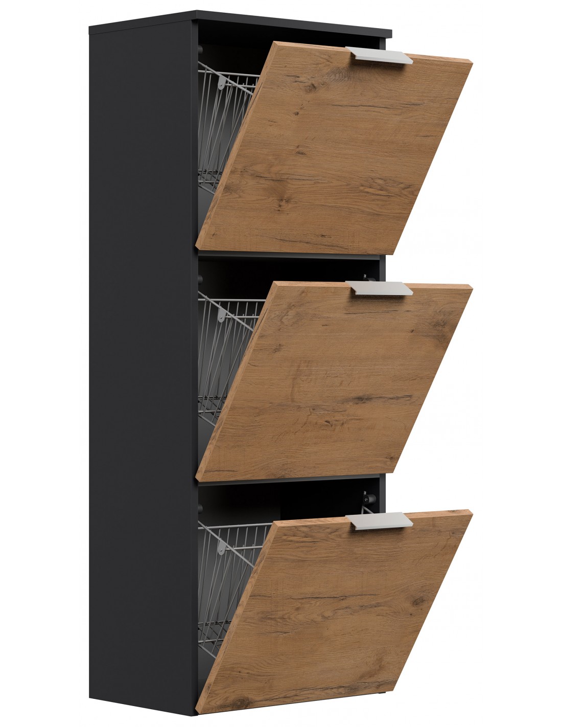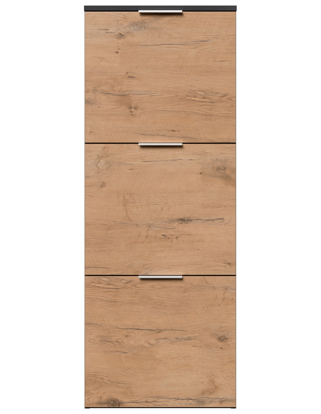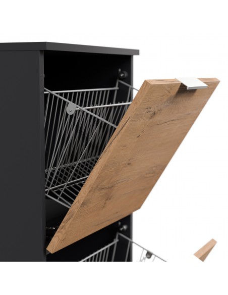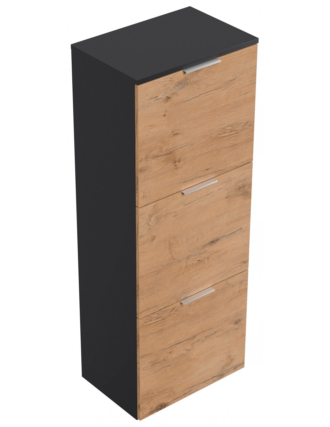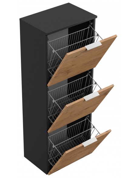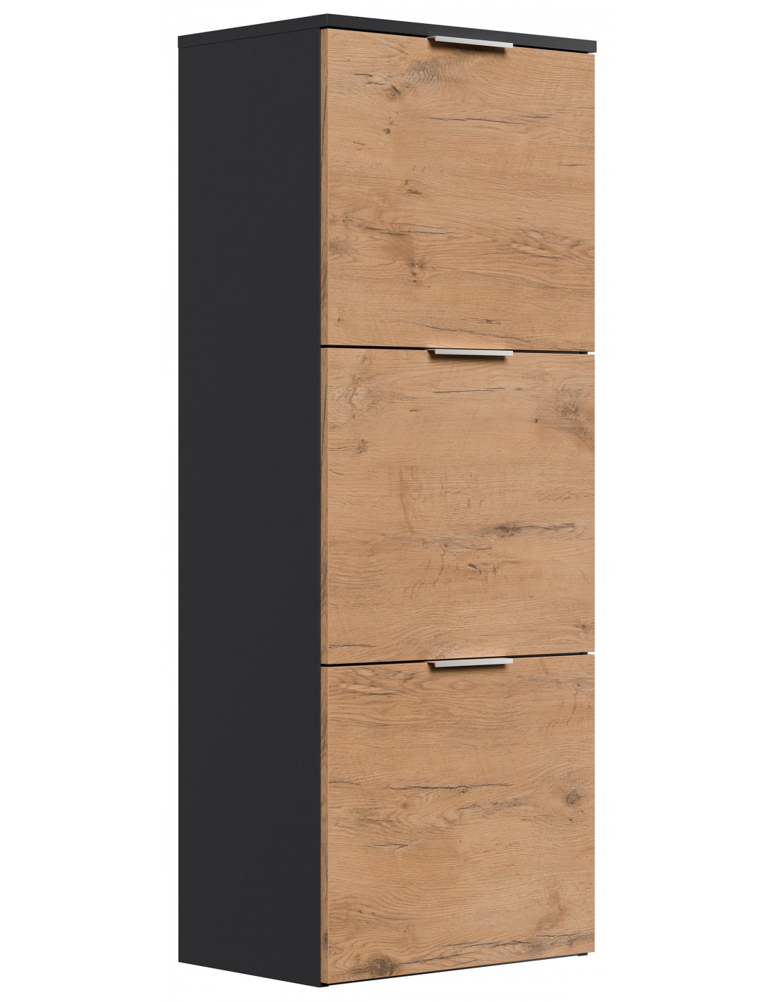 Væghængt skoskab udført i et design af grafitgrå og egetræsfarvet mdf og møbelplade. Skoskabet måler 138,9 cm i højden og 52,9 x 36,1 cm i bredde og dybde.