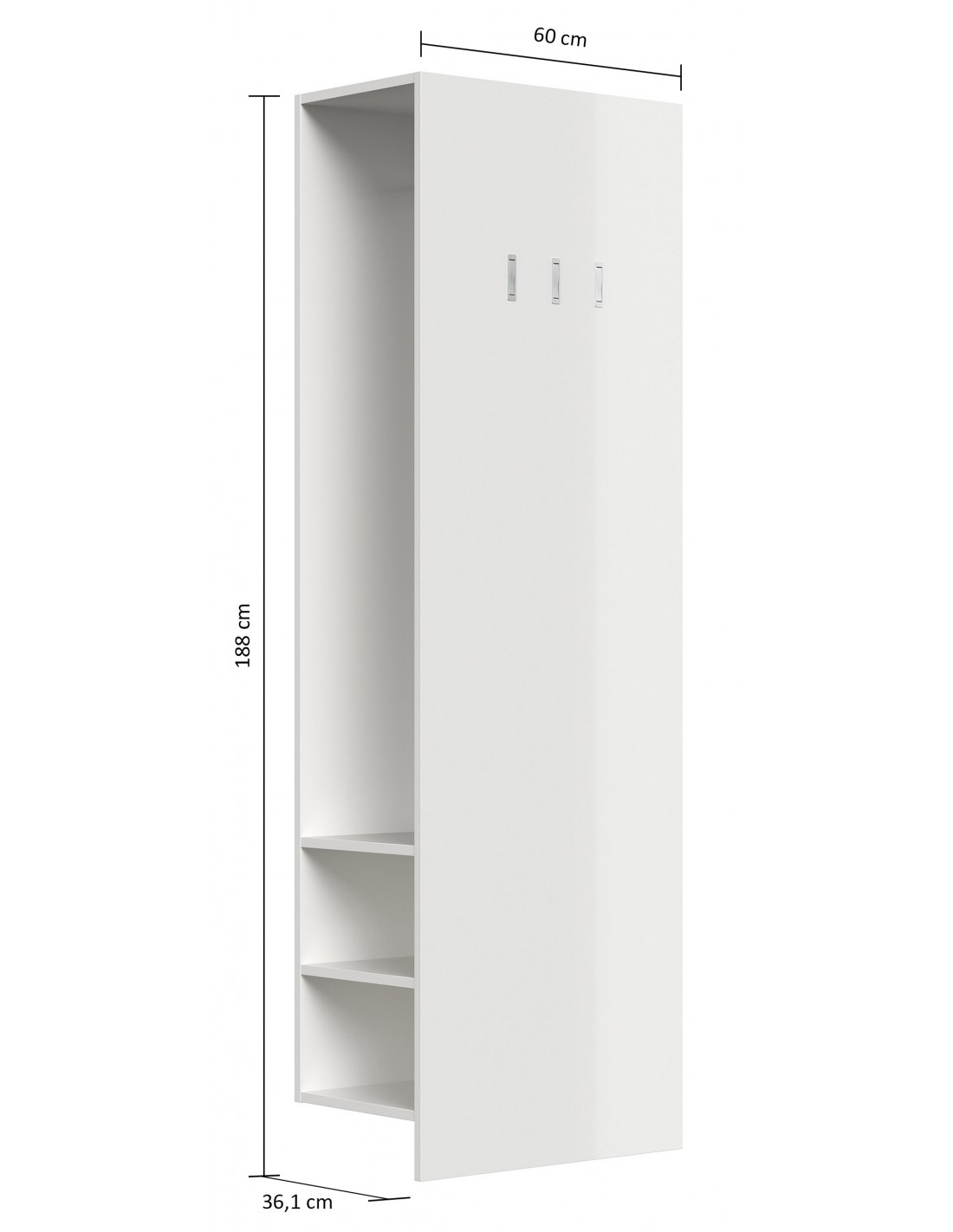 Garderobe med hylder, bøjlestang og knager, udført i et design af mdf. Garderoben måler 188 cm i højden og 60 x 36,1 cm i bredde og dybde.
