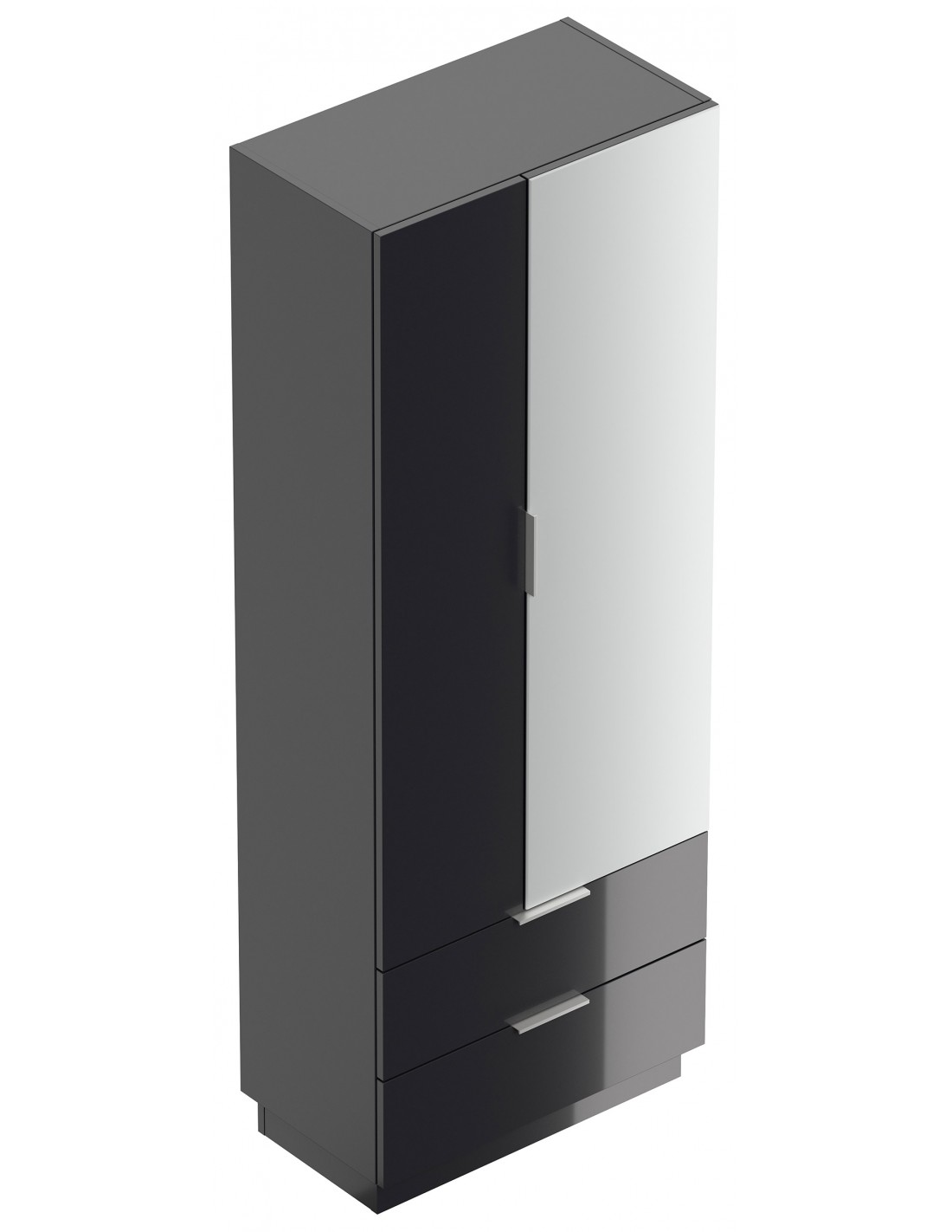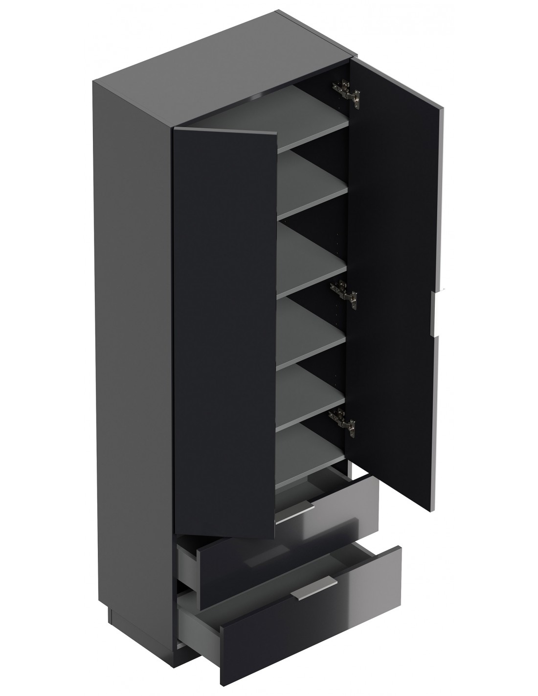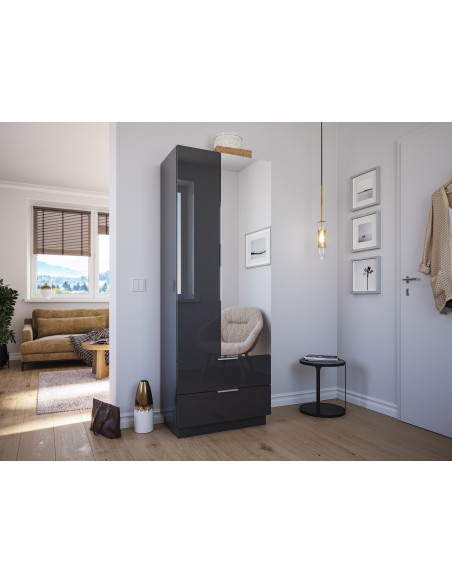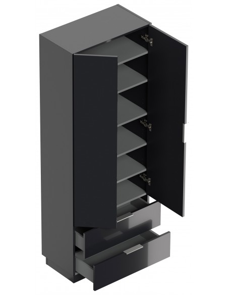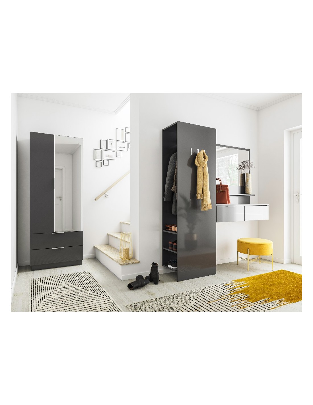 Garderobe og skoskab udført i et design af grafitgrå højglans mdf og møbelplade. Skabet måler 180 cm i højden og 70 x 38 cm i bredde og dybde.