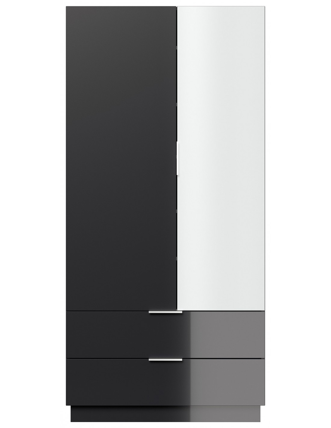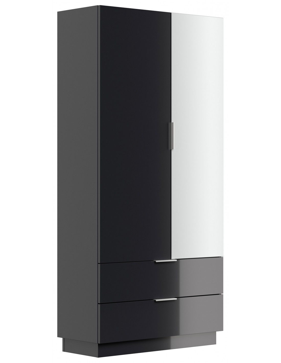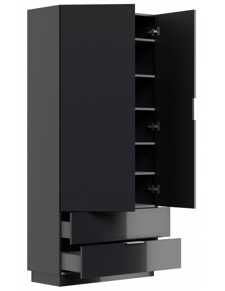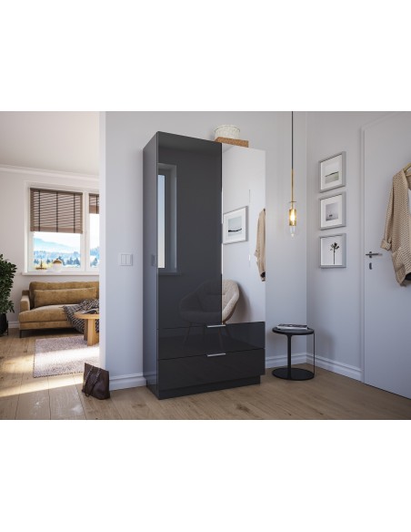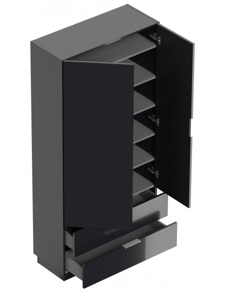 Garderobe og skoskab udført i et design af grafitgrå højglans mdf og møbelplade. Skabet måler 180 cm i højden og 90 x 38 cm i bredde og dybde.