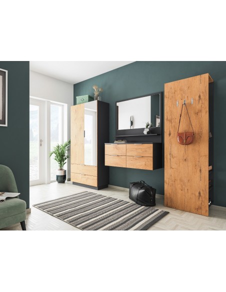 Garderobe og skoskab udført i et design af grafitgrå og egetræsfarvet mdf og møbelplade. Skabet måler 180 cm i højden og 90 x 38 cm i bredde og dybde.
