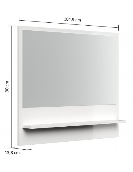 Vægspejl med hylde, udført i et design af mdf og glas. Spejlet måler 90 cm i højden og 104,9 x 13,8 cm i bredde og dybde.