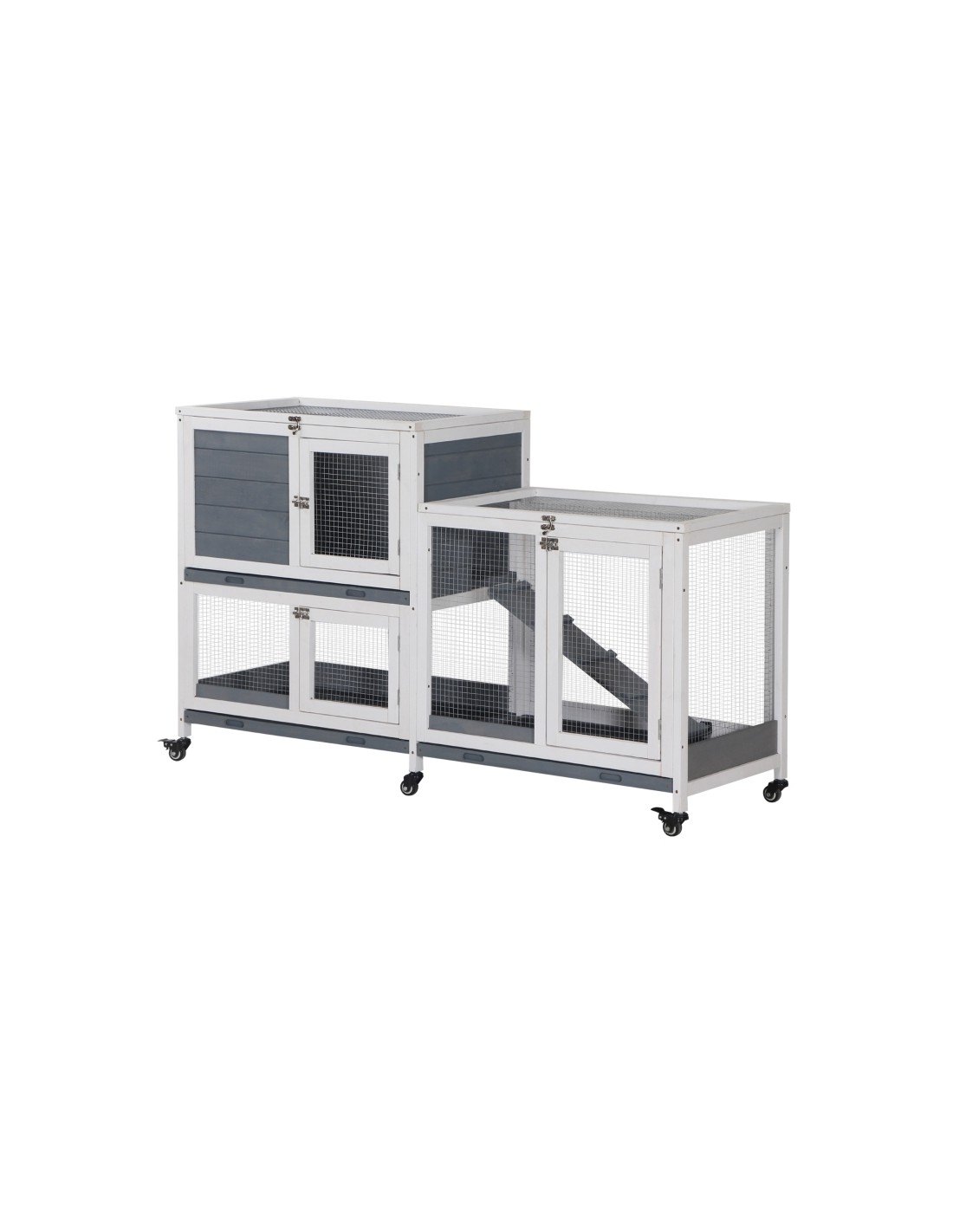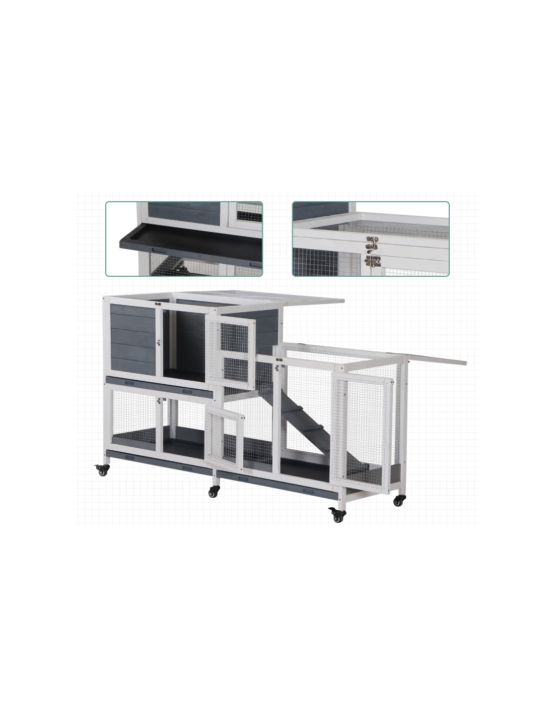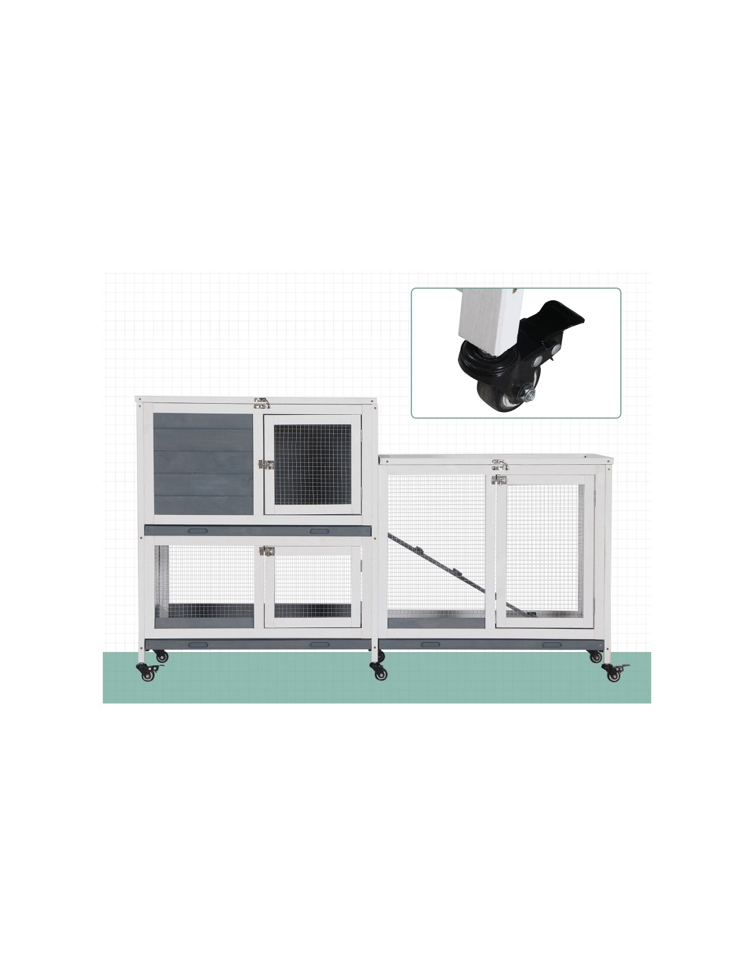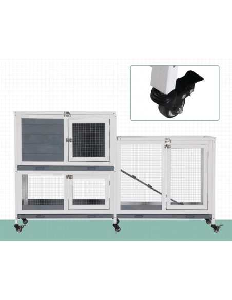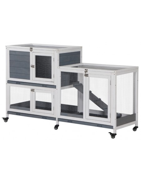 Dværgkaninbur på hjul i fyrretræ 147 x 45,5 x 88,5 cm - Hvid/Grå