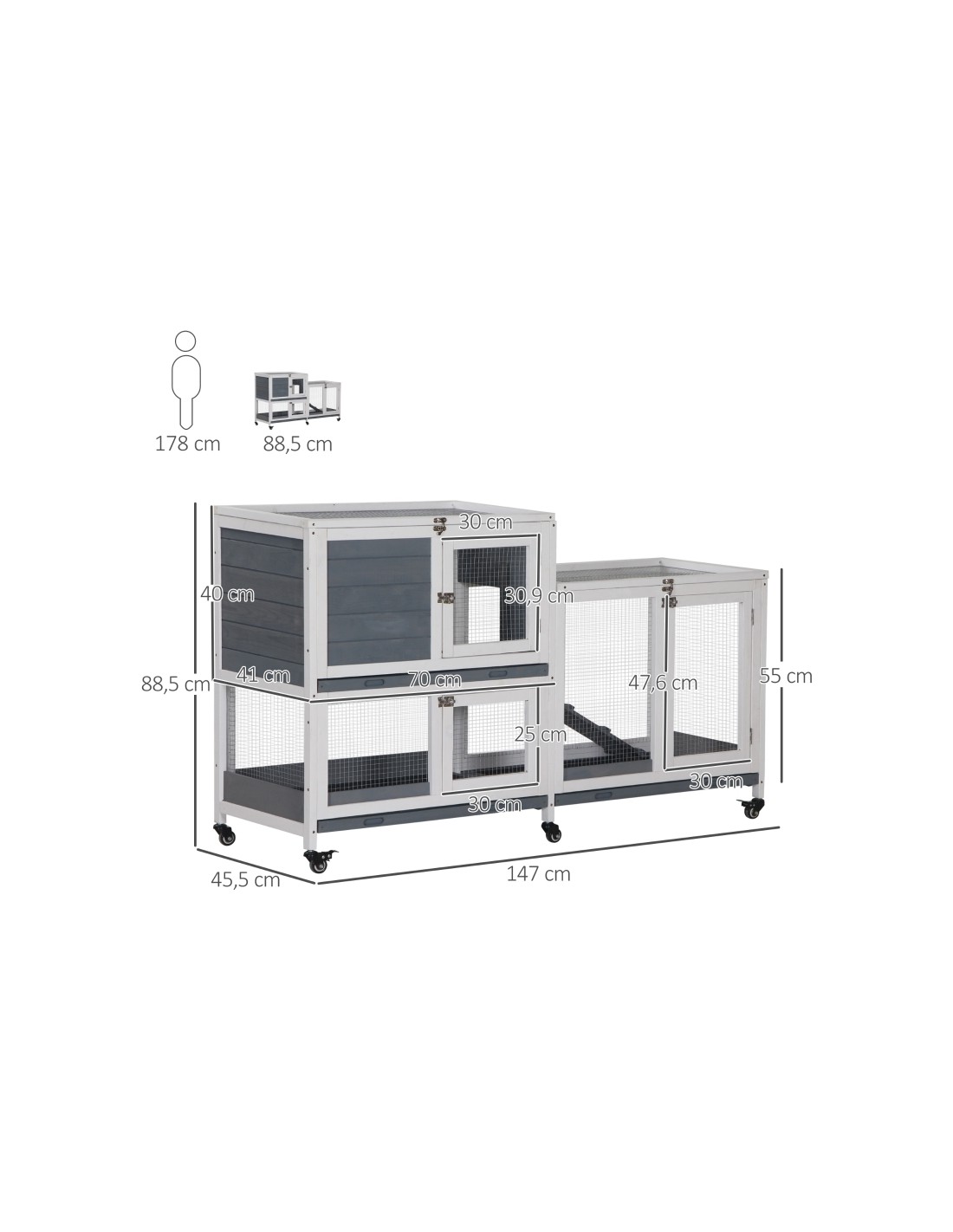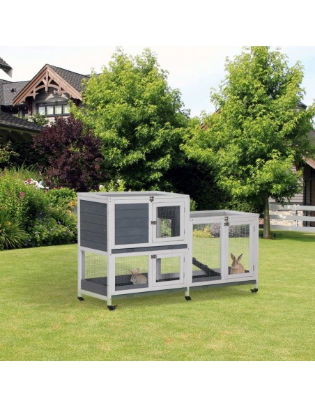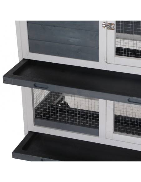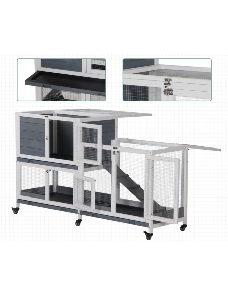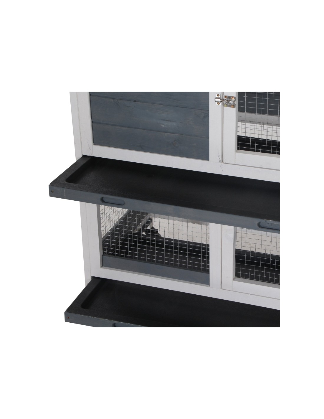 Dværgkaninbur på hjul i fyrretræ 147 x 45,5 x 88,5 cm - Hvid/Grå