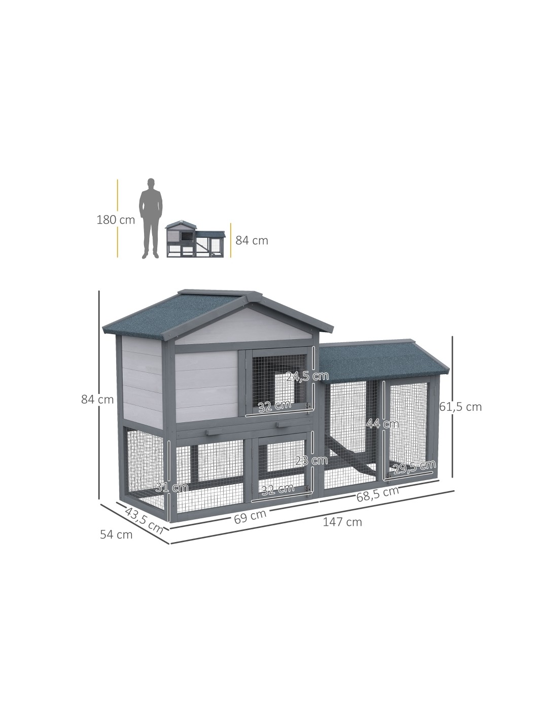 Kaninbur udført i et design af fyrretræ. Kaninburet måler 84 cm i højden og 147 x 54 cm i bredde og dybde. Vi anbefaler at sikre bunden i buret med en fast undergrund, såfremt kaninburet anvendes som permanent bolig for kaninen.