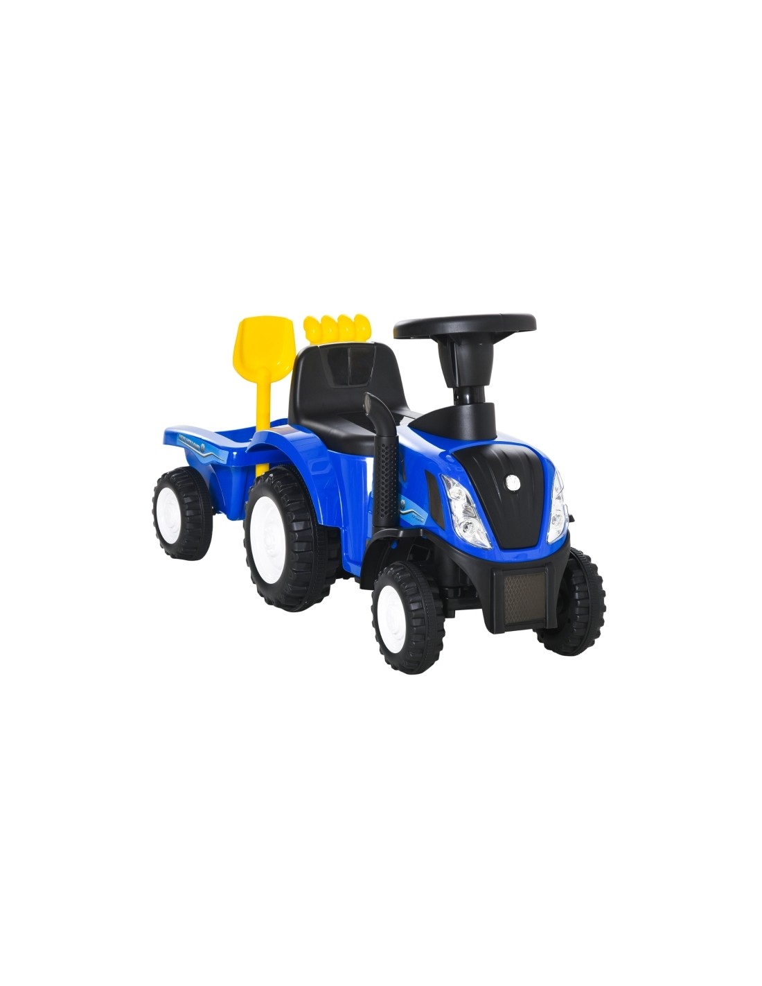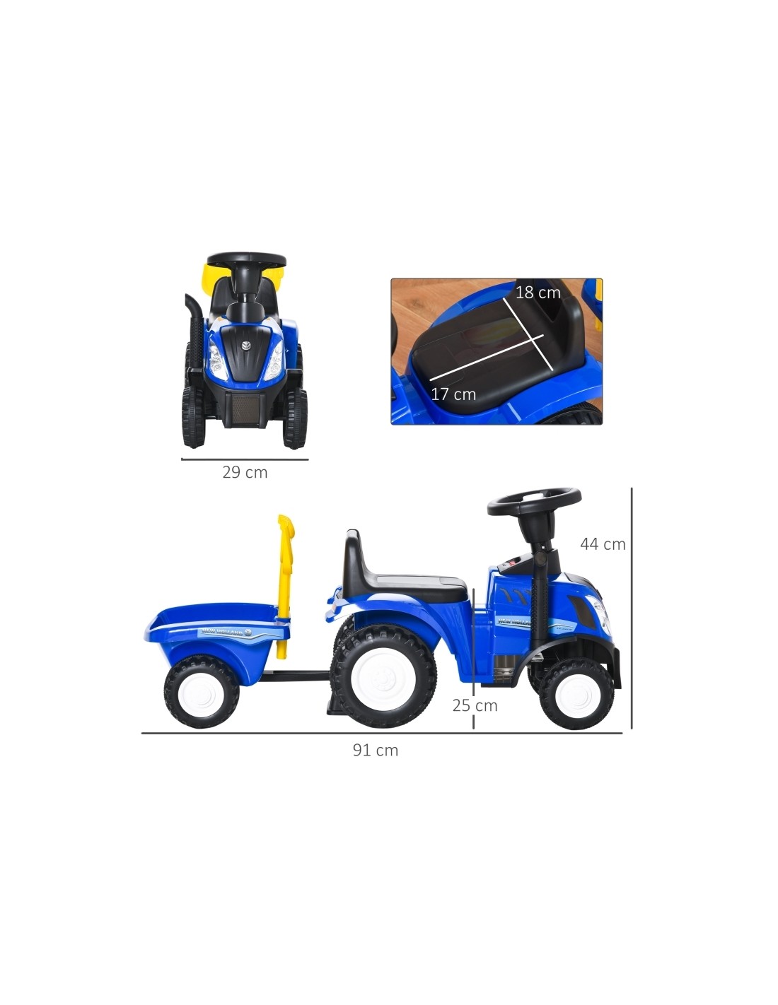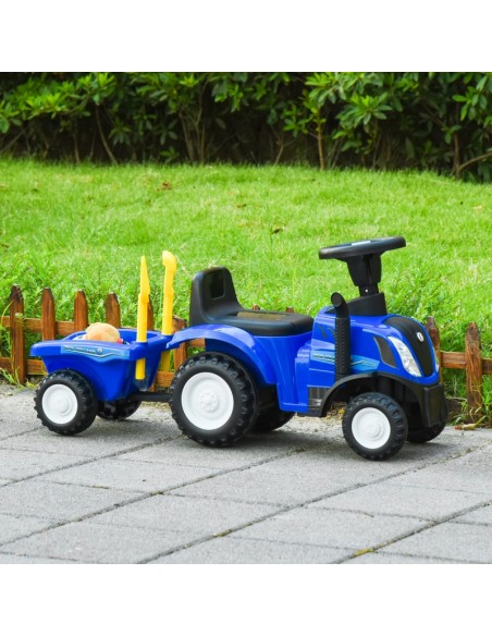 New Holland traktor med anhænger til børn, udført i et design af blå og sort kunststof og metal. Traktoren med hænger måler 91 cm i længden og 29 cm i bredden og har plads til et barn i alderen 1 - 3 år.