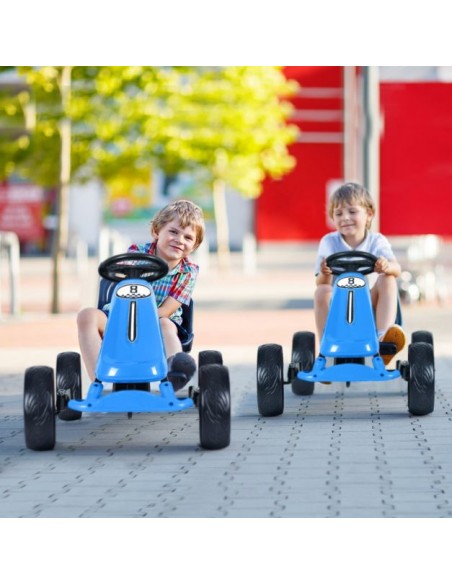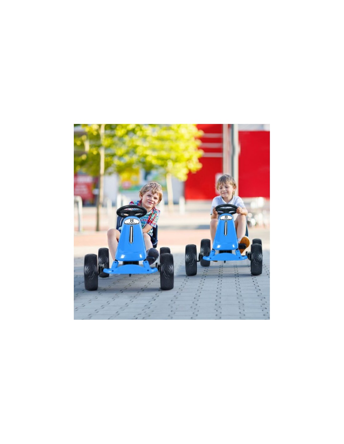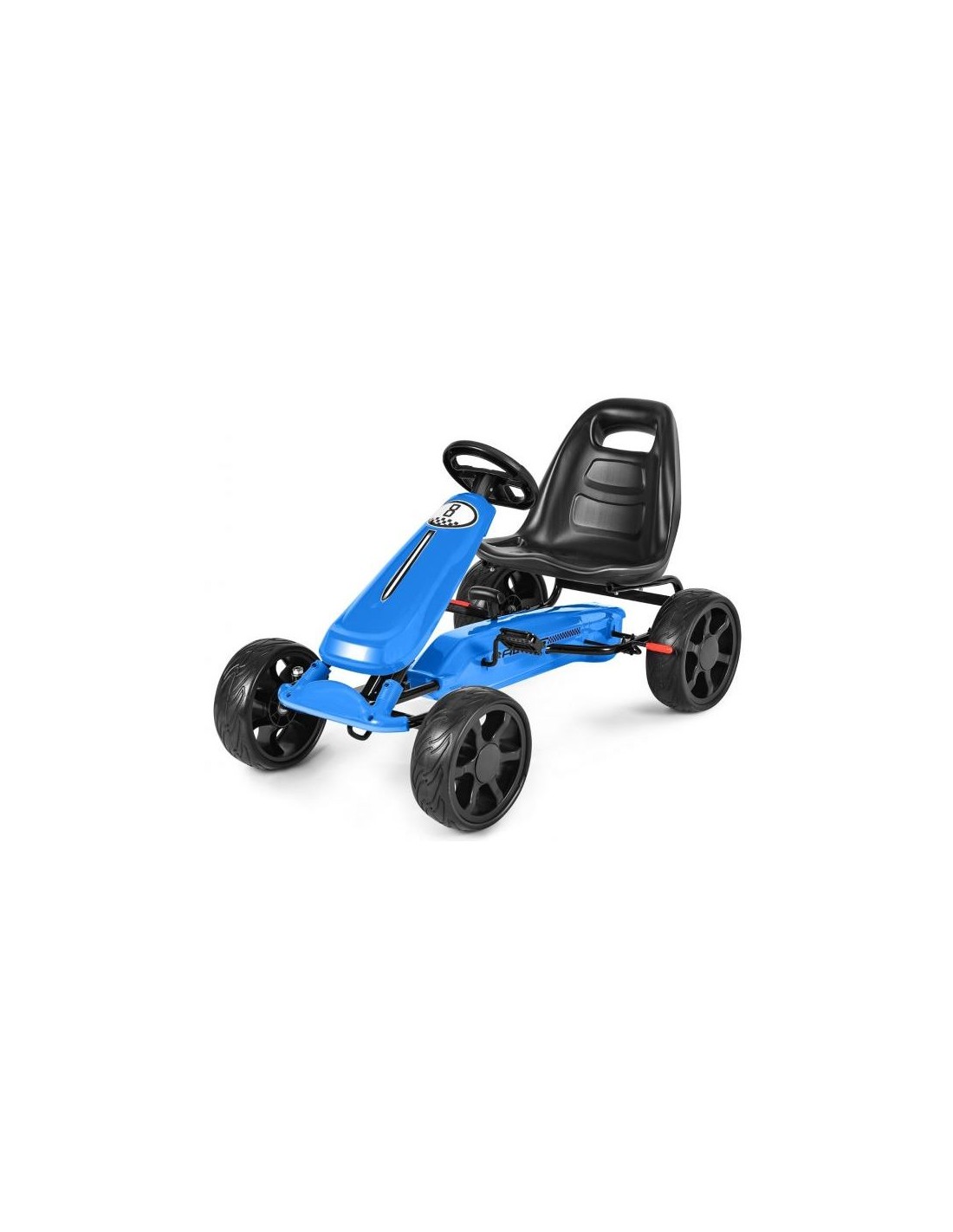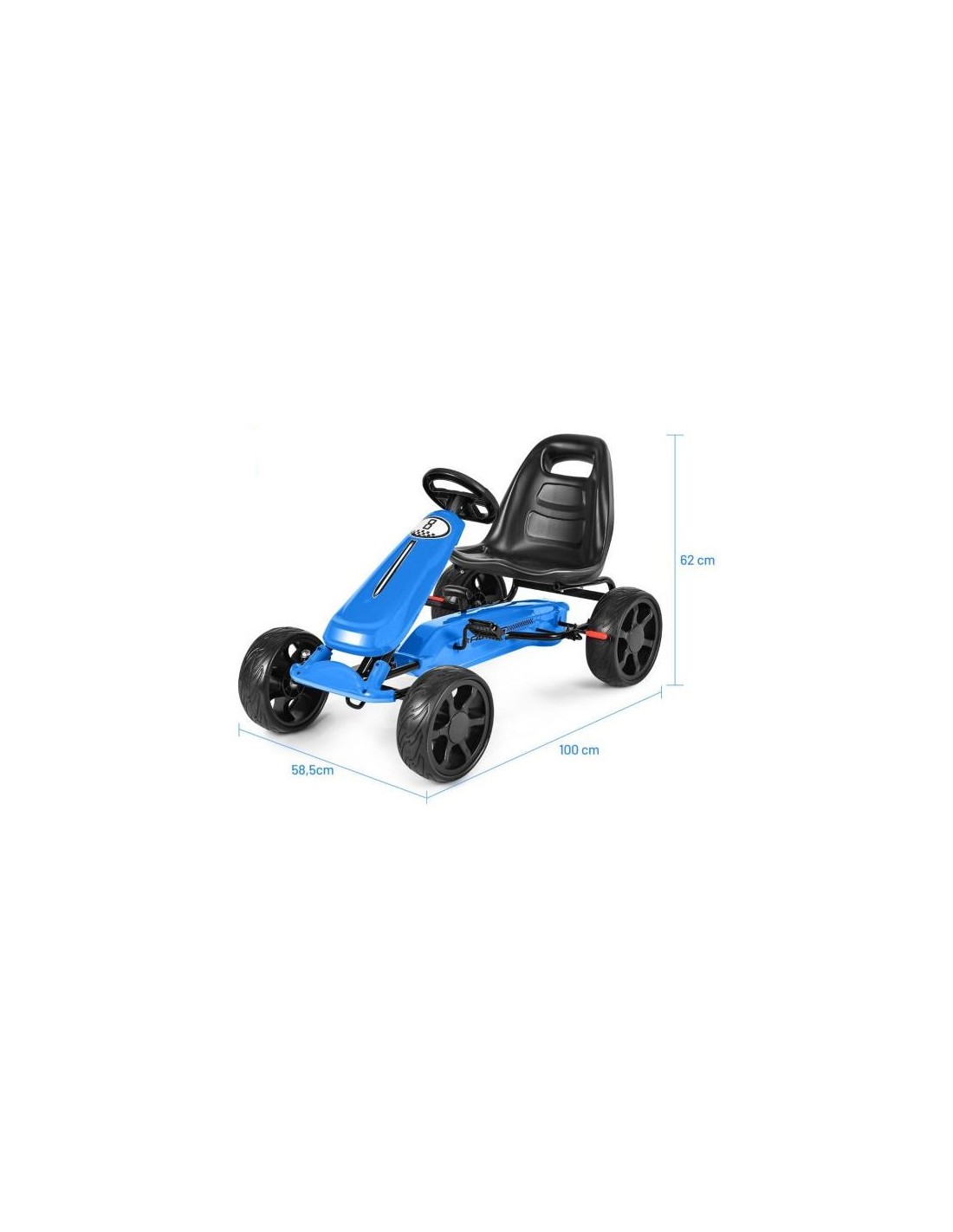 Gokart udført i et design af blå kunststof og metal. Gokarten måler 100 cm i længden og 58,5 cm i bredden og har en max. belastning på 30 kg.