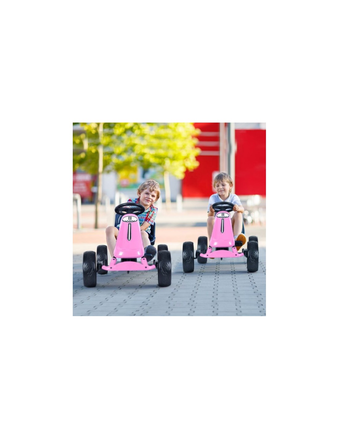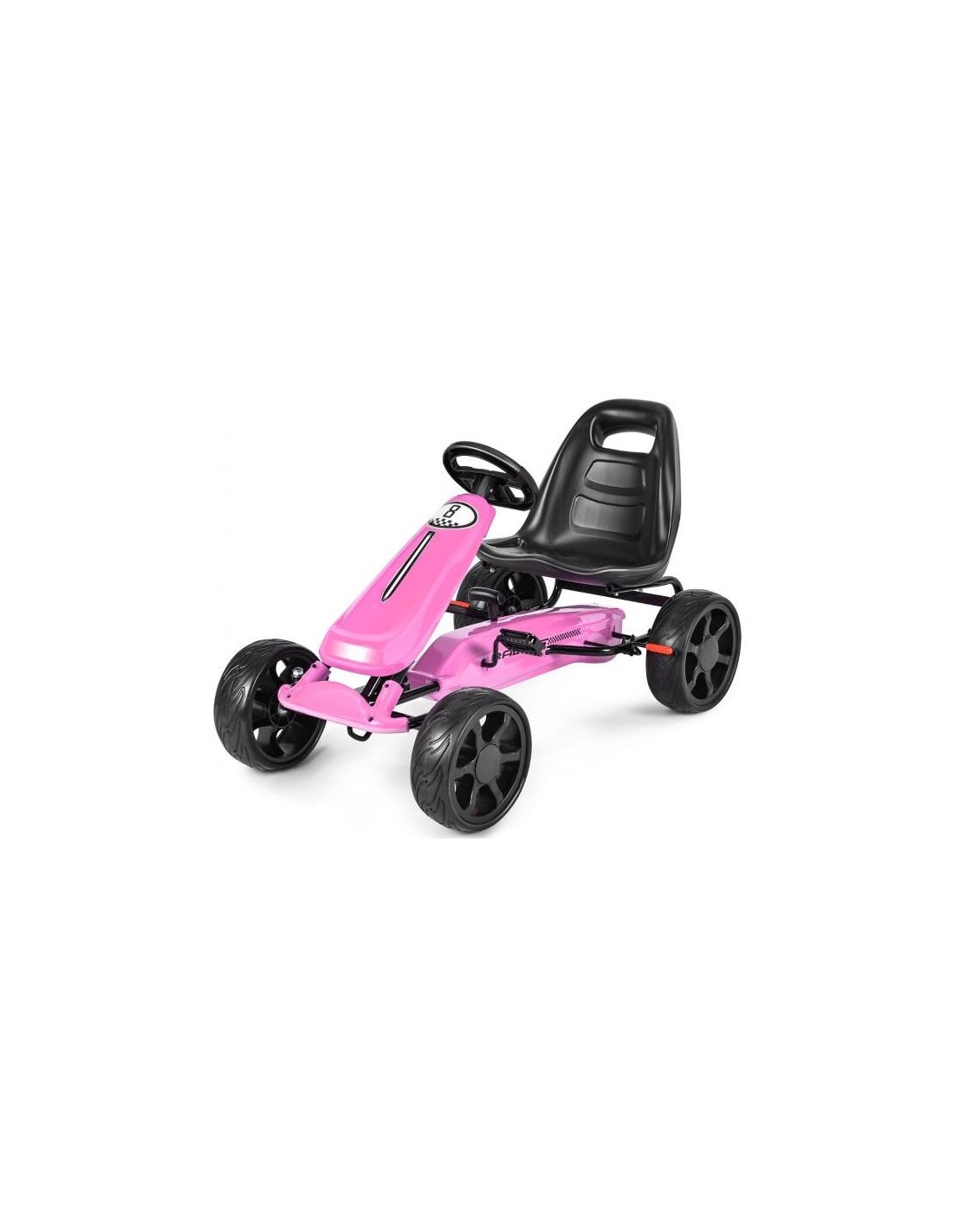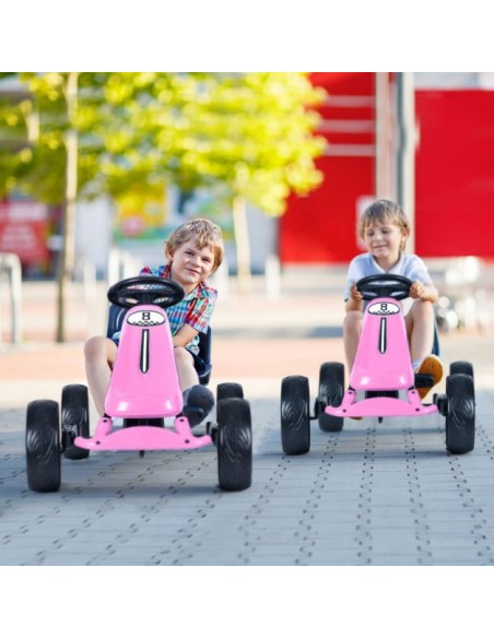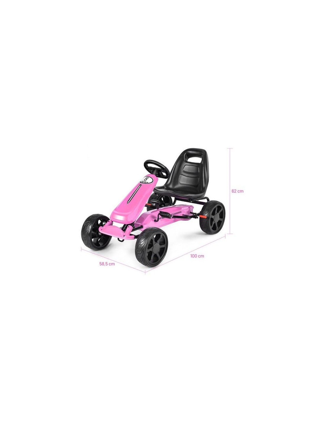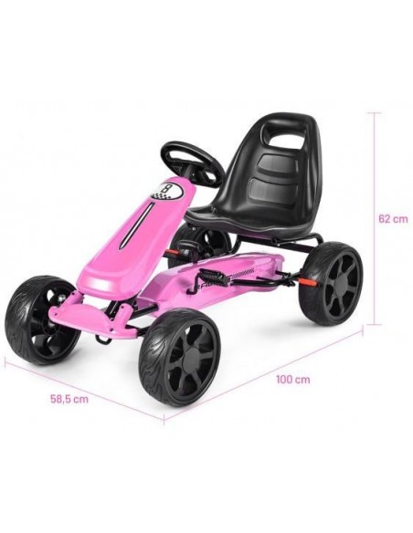 Gokart udført i et design af rosa kunststof og metal. Gokarten måler 100 cm i længden og 58,5 cm i bredden og har en max. belastning på 30 kg.