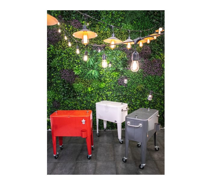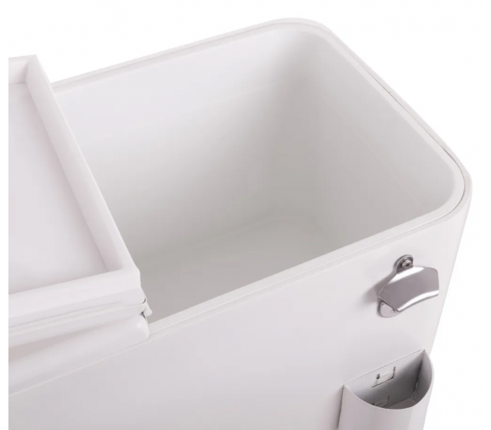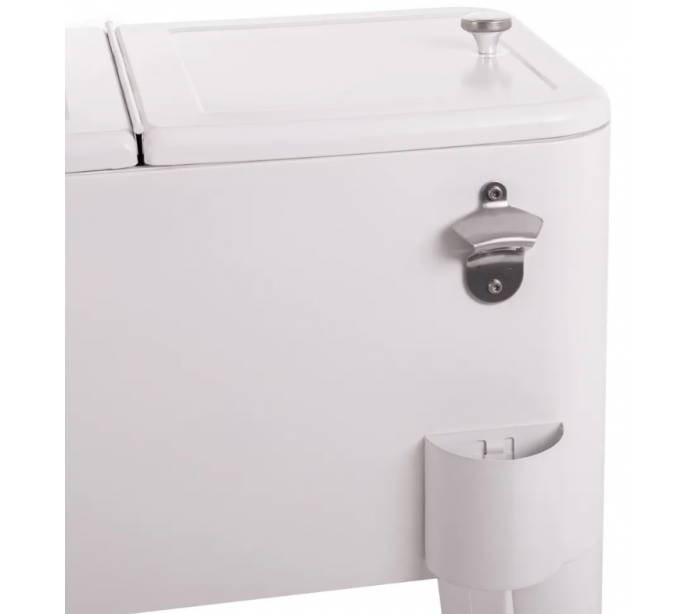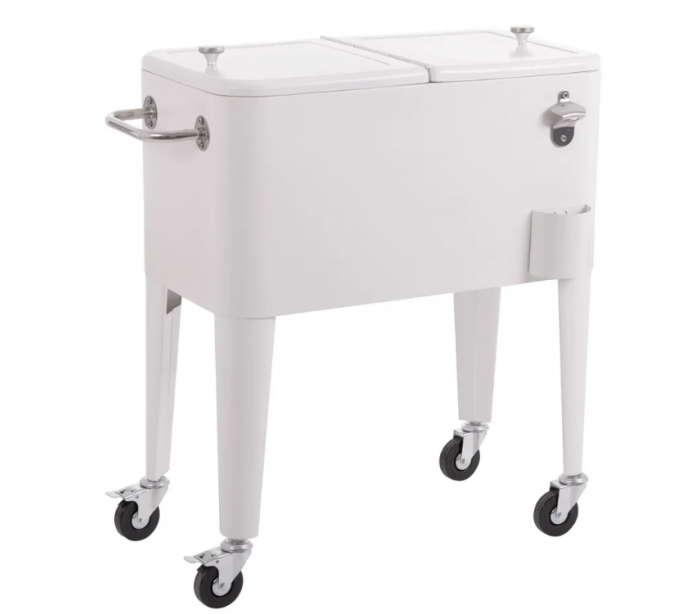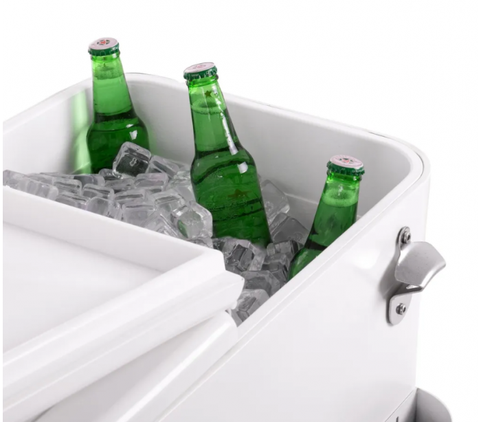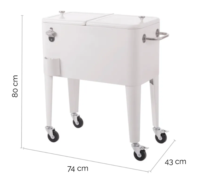 Retro kølevogn til have eller terrasse, udført i et design af hvidlakeret stål og med inderside/boks i polypropylene. Kølevognen måler 80 cm i højden og 74 x 43 cm i bredde og dybde og med 4 hjul, hvoraf 2 er låsbare.