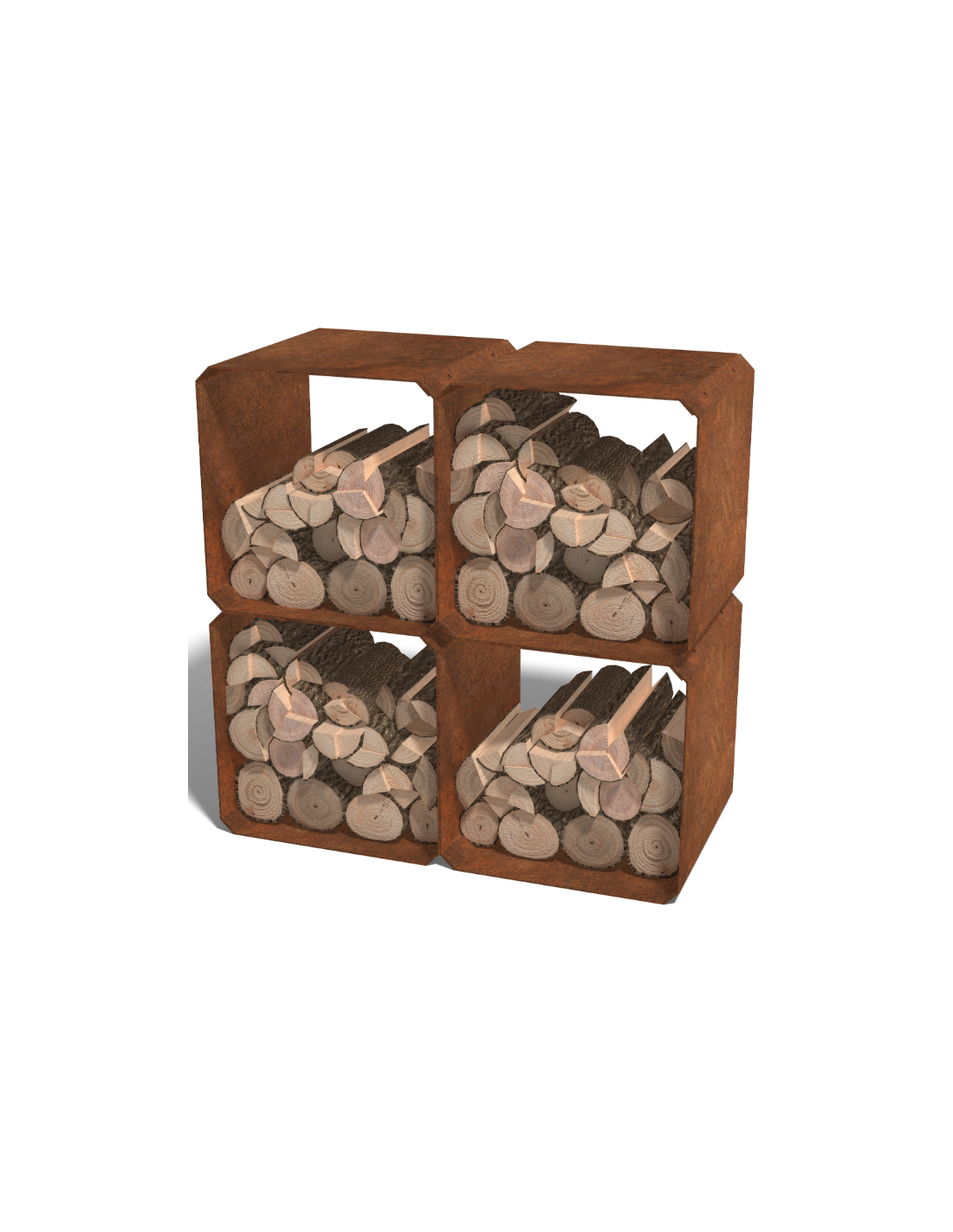 Brændereol udført i et smukt design af stål. Reolen består af 4 hylderum og måler 80 cm i højden og 80 cm i bredden. Hvert hyldeelement måler 40 x 40 x 40 cm. Reolen kan selvfølgelig opsættes efter ønske, og måler ikke nødvendigvis 80 x 80 cm.