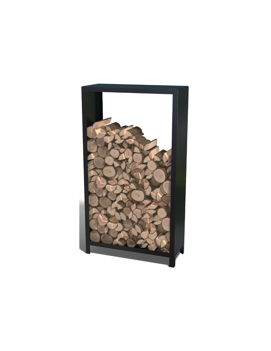 Brændereol udført i et smukt design af sort pulverlakeret stål. Reolen måler 180 cm i højden og 100 cm i bredden.