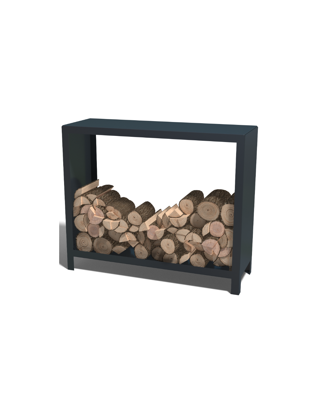 Brændereol udført i et smukt design af sort pulverlakeret stål. Reolen måler 100 cm i højden og 120 cm i bredden.