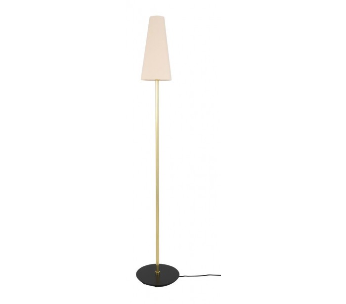 Rhyl gulvlampe i et moderne design, fremstillet i messing og sortlakeret stål med skærm i cremefarvet tekstil. Gulvlampen har afbryder på ledningen og måler 157 cm i højden.