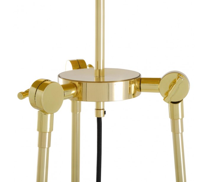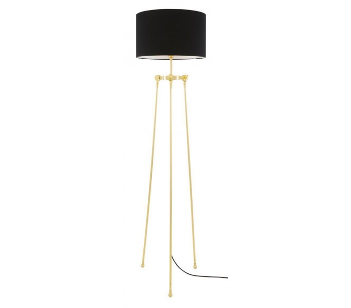 Erill gulvlampe i et moderne design, fremstillet med stel i poleret messing og skærm i sort tekstil. Gulvlampen har afbryder på ledningen og er justerbar i lampearmene således lavere højde kan opnåes. Lampen måler 162,5 cm max.