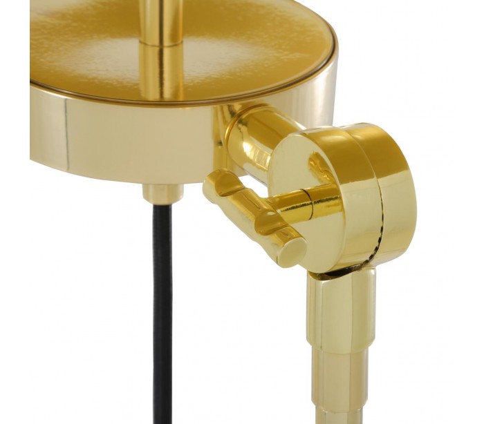 Lismore gulvlampe i et moderne design, fremstillet med stel i poleret messing og skærm i hvid tekstil. Gulvlampen har afbryder på ledningen og er justerbar i lampearmene således lavere højde kan opnåes. Lampen måler 162,5 cm max.