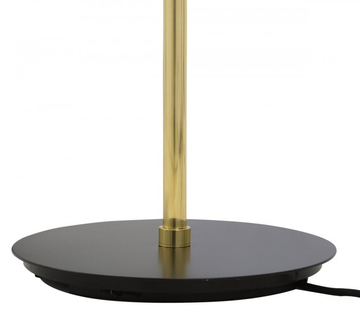 Lyre gulvlampe i et moderne design, fremstillet i messing og sortlakeret stål med skærm i cremefarvet tekstil. Gulvlampen har afbryder på ledningen og måler 148 cm i højden.